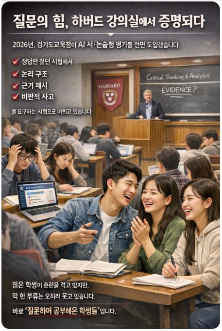 질문의 힘, 하버드 강의실에서 증명되다 2026년, 경기도교육청이 AI 서·논술형 평가를 전면 도입했습니다. 정답만 찾던 시험에서 → 논리 구조 → 근거 제시 → 비판적 사고 를 요구하는 시험으로 바뀌고 있습니다. 많은 학생이 혼란을 겪고 있지만, 딱 한 부류는 오히려 웃고 있습니다. 바로 ●질문하며 공부해온 학생들’● 입니다. 하버드 실험 : 강의 vs 질문 학습 Harvard University 연구진이 물리학 수업에서 흥미로운 실험을 했습니다. ✔ A그룹 전통적인 강의식 수업 ✔ B그룹 ‘소크라테스식 AI 튜터’와 끊임없는 문답 학습 결과는 놀라웠습니다. AI와 질문·반문을 주고받은 그룹의 학습 성취도 ▶▶▶강의식 그룹보다 2배 이상 높게....... <img src="https://blogthumb.pstatic.net/MjAyNjAyMjBfMjg2/MDAxNzcxNTg5MjQyOTc4.ENiIOJrYs7NeX_VKt-d7l4VevQTDFSxYOHjuA1JXQ78g.7bYouP9JkRQQvRKjY2lkX7AJjEu7STlMWvgBPNY78cMg.JPEG/%C4%B8%C3%B3.JPG?type=s3" />