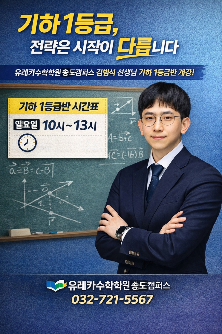 김범석 쌤의 기하 1등급 반 (유레카수학학원) 기하 1등급, 원리만 깨우치면 길이 보입니다 유레카수학학원 송도캠퍼스 김범석 선생님의 기하 1등급반 수업 안내 안녕하세요. 유레카수학학원 송도캠퍼스입니다. 자연계 상위권 대학을 목표로 하는 학생들에게 수학 선택 과목 중 하나가 아닌 전략 과목이 바로 기하입니다. 특히 기하에서 가장 핵심이 되는 단원은 바로 ‘벡터’ 입니다. 대학 공대와 자연과학대에서 다시 만나게 되는 내용이기 때문에 지금 제대로 이해하고 넘어가느냐, 아니면 공식만 외워두느냐에 따라 이후 학습의 깊이가 달라집니다. 유레카수학학원에서는 김범석 선생님의 기하 1등급반을 통해 흔들리지 않는 개념과 실전 문....... <img src="https://blogthumb.pstatic.net/MjAyNjAzMDhfMjQ0/MDAxNzcyOTM4MTk2MTU4.E8VFwxe4_reTMJf8lAPrs_KFj1RvgT1u7QcrnBC4gC0g.affXG1Vz3_CfnF4MDQHvd-rngFyxzpYXHVWi0FXDxJMg.PNG/%B1%E2%C7%CF%BB%F9%BB%E7%C1%F8.png?type=s3" />