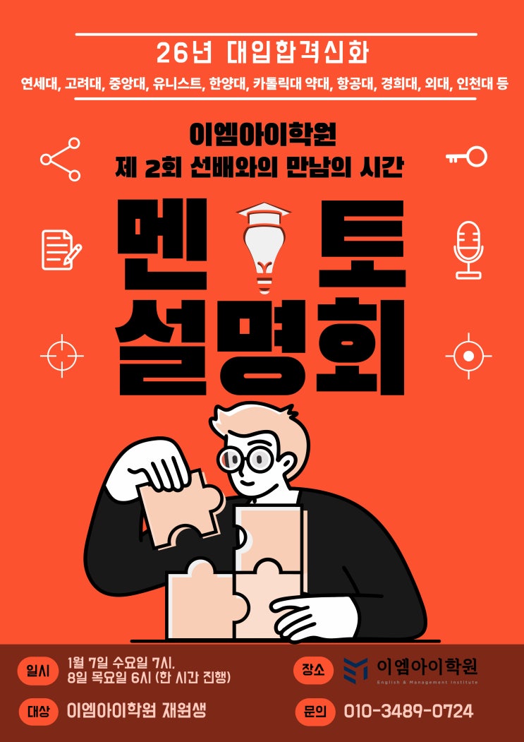 안녕하세요 이엠아이학원입니다. 2026년 새해가 밝았습니다. 저희 학원 강사진 모두 학생 여러분과 부모님들께 감사드린다는 말씀 전하며 모든 가정에 평화와 행복이 가득한 한 해가 되시길 바라겠습니다. ▶ 작년 서울대생 선배 특강에 이어 이번주 수요일(7시), 목요일(6시) '제 2회 선배와의 만남' 멘토링 특강이 1시간 동안 진행될 예정입니다. 연세대, 고려대, 중앙대, 유니스트, 한양대, 카톨릭대 약대, 항공대, 경희대, 외대, 인천대 등 26년 대입시험에 합격한 이엠아이학원 선배들이 직접 후배들을 만나 공부 방법 및 전략, 학교생활 가이드 자료를 제공하고 질의응답 등 함께 소통하는 시간을 가질 계획입니다. 맛있는 다과....... <img src="https://blogthumb.pstatic.net/MjAyNjAxMDVfNTQg/MDAxNzY3NjA4MzkwODY1.tnqcuGpoHiZiAitP96P4fWBDFxeEqFQ6yOTOCiE2Bzkg.8FKJov_Z79M6fsHHxzHEAKsiVv-90XkPypxts9lk_lAg.JPEG/%C1%A6%B8%F1%C0%BB-%C0%D4%B7%C2%C7%D8%C1%D6%BC%BC%BF%E4_-001_%2832%29.jpg?type=s3" />