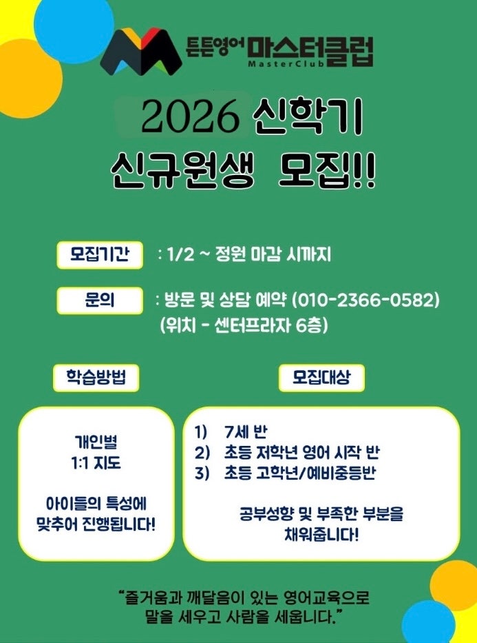 신학기, 우리 아이 영어 자신감을 세워주는 '튼튼영어 마스터클럽' 신규 원생 모집 안녕하세요! 어느덧 새로운 학기를 준비해야 하는 시기가 다가왔습니다. 우리 아이의 첫 영어 시작, 혹은 학년이 올라가면서 깊어지는 영어 고민 때문에 걱정이 많으시지요? 튼튼영어 서창학원에서 상담해보시고 해답을 찾아 보시는건 어떠실까요? 왜 '튼튼영어 마스터클럽 서창학원? 많은 학부모님이 저희를 믿고 선택해 주시는 이유는 분명합니다. 1. 1:1 개인별 맞춤 지도 아이들은 저마다 배우는 속도와 성향이 다릅니다. 진도만 나가는 판서식 수업이 아니라, 우리 아이의 특성에 맞춰 1:1로 밀착 지도합니다. 모르는 부분은 확실....... <img src="https://blogthumb.pstatic.net/MjAyNTEyMjNfODMg/MDAxNzY2NDM4Nzg0MDky.PEruiU6EsG_jfloTX2xiMUOQXZ9QaiJeoD8efCAO_e0g.TPOkVAd_uoRHMc6HKQd_qNT4hCt5_taCEJfyDLyx4dgg.JPEG/1766438759574.jpg?type=s3" />