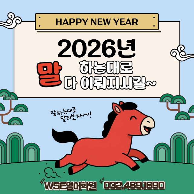 2026년 새해가 밝았습니다. 안녕하세요. WSE영어 학원 Sophie입니다. 다들 즐거운 새해~~맞이 하셨지요?? 새해에도~~ WSE영어에서 영어 실력자들이 되돍 함께 하겠습니다. 3주 몰입 특강은 원장 직강 소수 정예 선착순 마감 입니다. 우리 학생들이 학교를 다닐 때는 3개월에 문법 교재를 한권 끝냅니다. 그런데, 3주에 몰아서 매일 영어 문법을 공부하며 성취감도 느끼고 실력도 향상 시키며 규칙적인 공부습관을 유지하기 좋습니다. 신년에도 이벤트는 계속~~~됩니다. 파닉스 반에 대한 궁금한 사항은 연락주시면 답변 가능할 때 연락 드리겠습니다. 토셀은 의무가 아닙니다. 선택사항이니 실력 점검을 원하시는 경우 신청해주시면 됩니다. 2026....... <img src="https://blogthumb.pstatic.net/MjAyNjAxMDZfMjgg/MDAxNzY3Njk0NzIwNjA3.gtINUORID_FKzlsDgOwZZXFU8xR7hyVpT71v7O-ziH8g._A_T0zZyki7SIZGNGkt_7AFtqex6FWxFiynGiv0dxOkg.PNG/image.png?type=s3" />