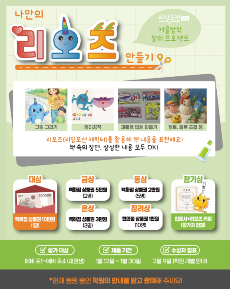 겨울방학! 아이의 상상력이 살아 숨 쉬는 리딩오션 겨울방학 프로젝트가 시작됩니다 바로 〈나만의 리오즈 만들기〉 창의 프로젝트! 리딩오션의 귀여운 캐릭터 ‘리오즈’를 활용해 책 속 장면, 마음에 남는 내용, 혹은 아이만의 상상 세계를 자유롭게 표현하는 활동이에요 ✨ 그림도 OK ✂️ 종이공작도 OK 점토·블록도 OK ♻️ 재활용 만들기도 OK 무엇이든 아이 스스로 표현했다면 모두 작품! ⸻ 참여 대상 예비 초1 ~ 예비 초4 재원생 제출 기간 1월 12일 ~ 1월 30일 ⸻ 푸짐한 시상 ✔ 대상 – 백화점 상품권 10만원 ✔ 금상 – 5만원 ✔ 은상 – 3만원 ✔ 동상 – 2만원 ✔ 장려상 – 편의점 상품권 1만원 ✔ 참....... <img src="https://blogthumb.pstatic.net/MjAyNjAxMDdfMjA0/MDAxNzY3NzQ0ODU2MjM0.XYSaMagHGSVinxtkNK6t246lLFaNYjdhe5eR97adYl8g.PD8AS7KRyhigQSohgdfAQwBlddc2sgkCgXx-QYwDDbgg.PNG/IMG%A3%DF8882.PNG?type=s3" />