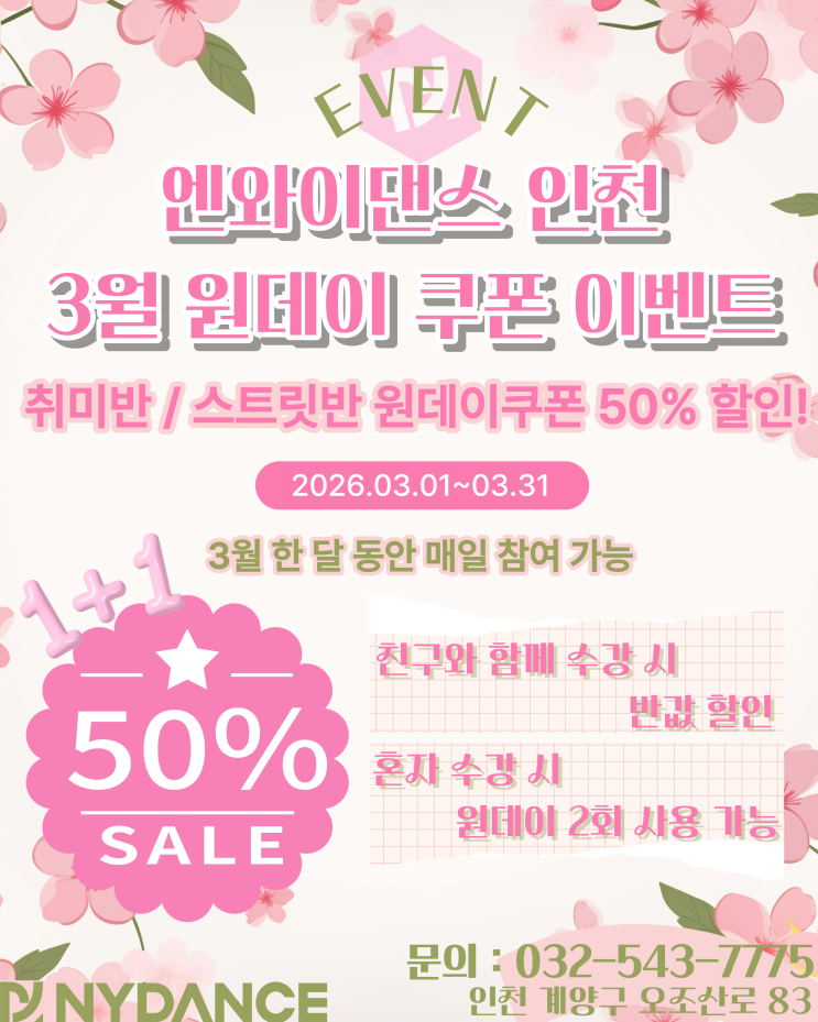 엔와이댄스 인천점 3월 원데이 쿠폰 이벤트 안녕하세요 :) 엔와이댄스 인천점입니다! 따뜻한 봄을 맞이해서 3월 한 달 동안 특별한 이벤트를 준비했습니다. 이번 이벤트는 취미반 / 스트릿반 원데이 수업을 50% 할인된 가격으로 참여할 수 있는 기회입니다! 평소 춤을 배워보고 싶었지만 망설이고 있었다면 이번 기회에 부담 없이 체험해보세요 이벤트 내용 ✔ 취미반 / 스트릿반 원데이쿠폰 50% 할인 ✔ 기간 : 2026.03.01 ~ 03.31 참여 방법 친구와 함께 수강 시 → 원데이 수업 반값 할인 혼자 수강 시 → 원데이 쿠폰 2회 사용 가능 이벤트 특징 ✔ 3월 한 달 동안 매일 참여 가능 ✔ 춤 처음이어도 누구나 참여 가능 ✔....... <img src="https://blogthumb.pstatic.net/MjAyNjAzMDZfOTcg/MDAxNzcyNzg2MjQ2OTkw.tDzsxFWc-Joav0Sj1rCOozYpAVzPlqELvIGeO2Jdfn0g.JTZUJpUrBCYb_zUnzJLQqFTsnGpqIeQbZZoQsXuPbpgg.PNG/3%BF%F9_%C0%CC%BA%A5%C6%AE.png?type=s3" />