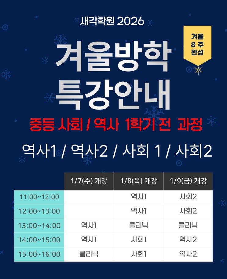 안녕하세요. 새각학원 새각지기입니다. 겨울방학을 맞이 하여 중등 사회/역사 특강을 진행합니다. 중등 역사1/역사2/사회1/사회2 주 1회 8주 완성 중등 역사1,2 / 사회 1, 2 특강 수업 안내 중등 과정에서 꼭 잡아야 할 역사·사회 개념을 한 번에 정리하는 특강 수업을 진행합니다. 1. 역사 1·2 / 사회 1·2 핵심 개념 집중 정리 2. 시험에 자주 나오는 내용 위주 구성 3. 흐름 이해 + 개념 정착으로 내신 대비 강화 4. 중고등 연계 수업 방학 및 단기 특강으로 사회 과목의 기초부터 탄탄하게 다질 수 있는 기회를 잡으시길 바랍니다. ※ 중등 역사1,2 / 사회 1, 2 정규반은 학원으로 문의하시길 바랍니다. 교육문의 02.6338.3737 010.6338.9672 <img src="https://blogthumb.pstatic.net/MjAyNTEyMjlfMTU3/MDAxNzY3MDE1NzQ1MTQw.yzkAeXJybYewiiUe0k89NKET-8Y2vSddn7uite2Pcqsg.CaM-TKCg0Bd-Z42GcxG9yj_wT6mzwr9YMnDA9KmQhWwg.JPEG/%C1%A6%B8%F1%C0%BB-%C0%D4%B7%C2%C7%D8%C1%D6%BC%BC%BF%E4__%BA%B9%BB%E7%BA%BB-_5_-001_%285%29.jpg?type=s3" />