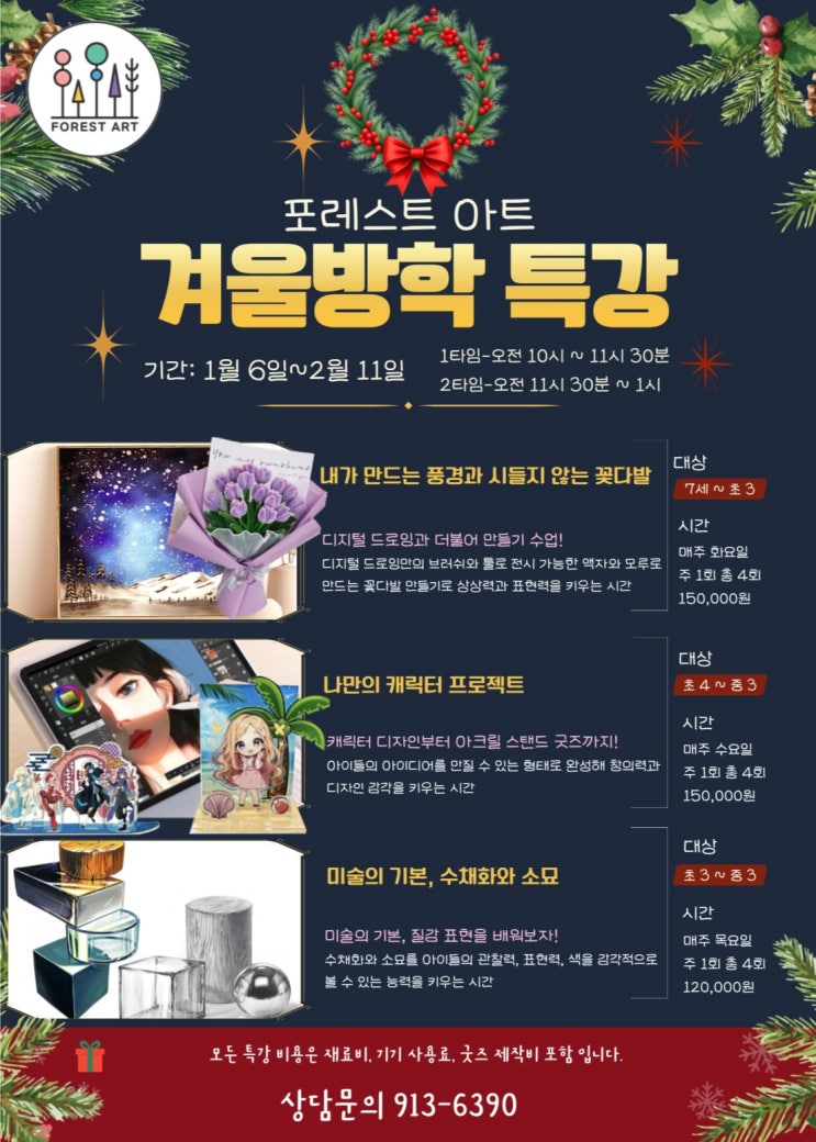 안녕하세요 포레스트 아트입니다. 유난히 추운 이번겨울, 우리아이들이 따뜻한 실내에서 예술적 감성을 마음껏 펼칠 수 있도록 겨울방학특강을 정성껏 준비 했습니다. 디지털 드로잉부터 수채화/소묘 까지! 아이들의 연령과 관심사에 맞춘 3가지 맞춤형 커리큘럼을 소개합니다. 포레스트 아트 겨울방학 특강 안내 기간: 1월 6일~ 2월11일 시간대: [1타임] 오전 10시~11시30 [2타임] 오전11시30~1시 프로그램 01. 내가만드는 풍경과 시들지 않는 꽃다발 디지털 드로잉과 만들기의 만남! 디지털 드로잉만의 특별한 브러쉬를 활용해 멋진 풍경화를 그리고, 모루를 이용해 직접 꽃다발까지 만들어보는 수업입니다. 상상력을 자극하고 성취감을 선....... <img src="https://blogthumb.pstatic.net/MjAyNTEyMjlfMTcw/MDAxNzY3MDAyODYzNzcw.ATGU09FjP_q3JAXm6zgsyWy0LWWqqYsrDK2hbEuNABcg.zqX3AEvBu54FpAhFIe8BEluQhUQ8Le6XmZEzVAiNqXgg.JPEG/KakaoTalk_20251220_112714142.jpg?type=s3" />