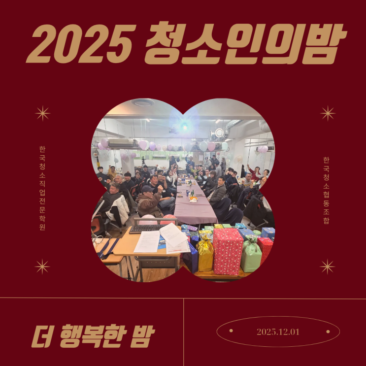 2025년 12월 1일 지난 한 해 동안 각자의 현장에서 묵묵히 일해온 청소인들이 잠시 손을 내려놓고 한자리에 모였습니다. 2025년 청소인의 밤은 한국청소직업전문학원이 주관하고 한국청소협동조합이 주최하는 연말 행사였은데요, 단순한 행사라기보다 같은 은일을 하는 사람들이 서로의 수고를 확인하고, 경험을 나누며 다시 힘을 얻는 시간이었습니다. 청소인의 밤, 어떤 자리였을까요? 아닐 행사에는 청소 현장에서 일하고 있는 분들, 청소를 직업으로 키워가고 있는 분들, 그리고 이제 막 시작을 고민하는 분들이 함께했습니다. 서로의 이야기를 듣고, 웃고, 공감하고, 혼자 현장에 서 있을 때는 느끼기 어려운 우리가 함께 일하고 있다는 감....... <img src="https://blogthumb.pstatic.net/MjAyNTEyMzFfMTk5/MDAxNzY3MTYzMTgyMTUx.jCUgJ0Dq-JJIPdDEEB9JosRp4zDjtyQLnPu6mM1tuQsg.rEsQg9aoRHqfoXVntx0hYtlmpiBT6H5RwBwGNUVH7N4g.PNG/2025_%C3%BB%BC%D2%C0%CE%C0%C7_%B9%E3_%BA%ED%B7%CE%B1%D7.png?type=s3" />