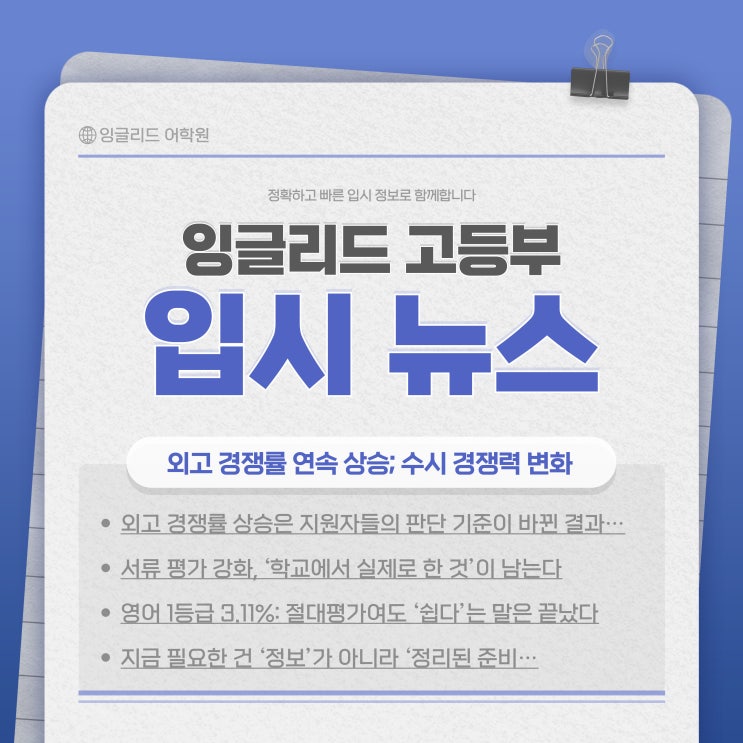 안녕하세요. 영어의 새로운 패러다임을 만들어가는 동대문구 장안동에 위치한 중·고 영어전문학원 Englead 잉글리드 어학원입니다! 외고 경쟁률 4년 연속 상승 수시 경쟁력, 이제는 ‘준비 방식’에서 갈립니다 연말이 되면 학부모님들의 고민이 더 또렷해집니다. “우리 아이에게 맞는 고등학교는 어디인가” “입시 흐름이 바뀌는데 지금 무엇을 준비해야 하는가.” 이 질문에 최근 데이터가 하나의 힌트를 줍니다. 2026학년도 외국어고 정원 내 경쟁률이 평균 1.47대 1로 집계되며 4년 연속 상승 했습니다. 이 수치는 단순히 ‘외고가 다시 인기다’ 라는 말로 끝낼 일이 아닙니다. 오히려 입시에서 유리해지는 준비 방식이 바뀌고 있다는 신....... <img src="https://blogthumb.pstatic.net/MjAyNTEyMzFfMjMz/MDAxNzY3MTY3Mzk0MjUx.jPe6N8HpByVIx3LCcd8yMx9ruUNbviN_-HHaT6g4mCIg.aV4kSxFZL7_ZdyQU-ltpuvhSSzftsA5W1CeULr06PgYg.JPEG/001.jpg?type=s3" />