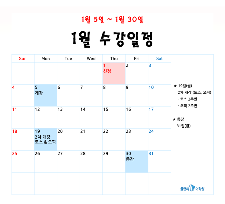 #토익 #토익스피킹 #오픽 #2주반 #온종일반 #점수보장반 #토익환급반 즐거운 새해, 겨울방학을 맞이하는 학생분들을 위해 플랜티 1월 강의 일정 안내 드리겠습니다! [강의 일정] 모든 수업은 월~금 평일은 다 진행됩니다. 1월 수업은 5일(월)에 시작해서 30일(금)에 끝날 거예요. 1월 2일(금), 3일(토) 이틀은 학생분들의 상담을 위해 열려있을 예정이니 궁금한 점 있으시면 연락 주세요!! [강의 시간표] 플랜 토익은 LC & RC 수업 2시간 (+ 스터디 1시간) 으로 진행되고, 스터디는 개강 이후 신청하시면 무료로 할 수 있어요. 기본반은 2일차 수업 후 스터디 신청 실전반은 1일차 수업 후 스터디 신청 토익은 기본반 / 실전반 레벨을 나눠서....... <img src="https://blogthumb.pstatic.net/MjAyNTEyMDVfOTgg/MDAxNzY0OTI0MTMwODcx.WA6Sm_6LlPnC5LkIhTK-w41-OdCjf3s6xwX_y2adcsUg.GFEJXHVPTrtiPumr8l0gfpcS-4BREuQQrKQIDWc2x2wg.PNG/naver1.png?type=s3" />