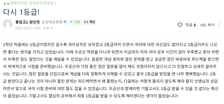 다시 1등급! 풍암고2 윤** 1학년 처음에는 1등급이였지만 갈수록 국어성적은 낮아졌고 3등급까지 뜨면서 국어에 대한 자신감도 없어지고 2등급이라도 나오 면 좋다는 생각을 가지고 있었습니다. 이때 우공산 학원을 다니게 되면서 지금까지 저의 국어 공부 시간이 많이 부족했고 혼자 하면 서 부족한 점도 많았다는 것을 깨달을 수 있었습니다. 꼼꼼한 개념 정리와 많은 문제를 받고 궁금한 점은 바로바로 피드백을 받으면 서 체계적으로 시험을 준비했습니다. 우공산의 가장 좋은 점은 질문을 많이 해도 귀찮아하지 않으시고 다 친절하고 상세히 알려주 시는 것입니다. 많은 질문을 던짐으로써 개념을 더욱 정확하게 이해할 수 있었고 결국 1등....... <img src="https://blogthumb.pstatic.net/MjAyNjAyMTFfOTgg/MDAxNzcwODA4NDk0MTk2.gfazoQhxNqsxvNVVoOh5aJeFLQTpGXnulN83SZ8xVrcg.a7qPzIPAa6Pw7O4T-sI6fcDr6qpT0F4c8DwCYadLaC8g.PNG/image.png?type=s3" />