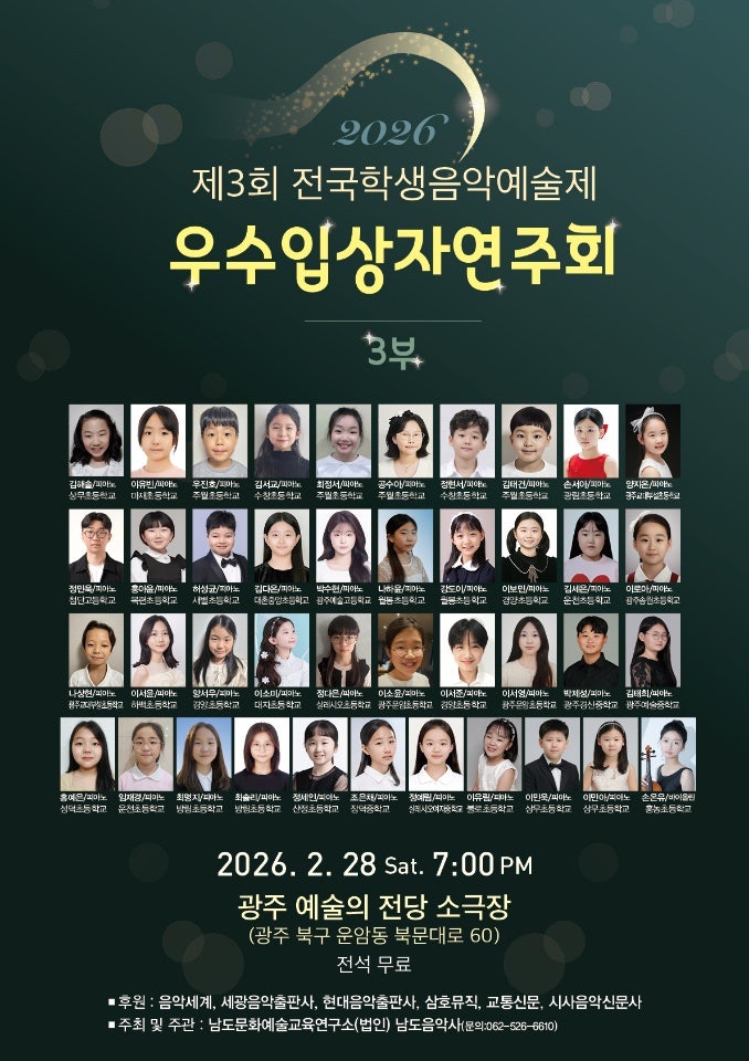 연주회 소식입니다. 지난해 말에 열렸던 콩쿨에서 대상을 받은 제 학생 두명이 우수입상자 연주에 참여하게 되었습니다. 관객들이 있는 연주엔 혼자 연주할때와는 다른 큰 긴장감으로 무대에 오르게되는데, 지금까지 준비해냈던 시간들이 아름답게 표현될 수 있길 바랍니다. 1월엔 원내 정기연주회가 있었습니다. 고사리같은 손으로 성장한 모습을 연주로 풀어내는 시간입니다. 모두들 떨렸지만 여러번의 리허설과 단단한 연습시간으로 좋은 공연으로 마무리 지을수 있었습니다. 쿤스트 음악인들의 성장을 확인해볼수 있는 뜻깊은 시간이였습니다. <img src="https://blogthumb.pstatic.net/MjAyNjAyMTFfOTkg/MDAxNzcwODAzNjI2NDYz.6JfO9WWHu5rqv-9cW0rxGW0ejmdUnoyKNrdm0DXgxeEg.3VN-znnLKXuP29jxgtwwfzBY_bcAjRlhljbQwXRKosog.JPEG/IMG%A3%DF3519.JPG?type=s3" />
