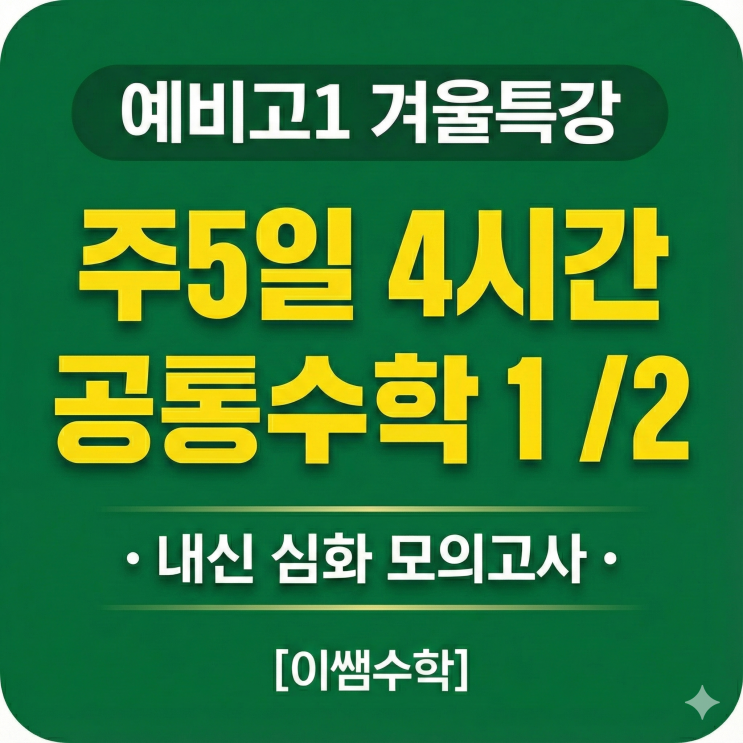 고등 수학의 성패는 '첫 단추'를 어떻게 끼우느냐에 달려 있습니다. 겨울방학을 어떻게 보내느냐에 따라 1학기 첫 내신 등급의 격차는 분명하게 벌어집니다. 이에 이쌤수학에서는 "고등수학, 처음부터 제대로!"라는 슬로건 아래, 고등수학을 처음 시작하는 예비고1 학생들을 위한 주5일·하루 4시간 집중 프로그램을 준비했습니다. ■ 프로그램 특징 공통수학 1, 2 전 과정 완전 정복 : 개념 이해부터 심화 유형까지 체계적 마스터 주5일, 일 4시간 몰입형 수업 : 기초를 단단히 다지고 실전 응용력 극대화 내신 1등급 목표 : 논리적 풀이 과정을 습득하여 고난도 문항까지 완벽 대비 ■ 시간표 안내 현재 : 화/목/토 (4시~6시....... <img src="https://blogthumb.pstatic.net/MjAyNTEyMTdfMTc5/MDAxNzY1OTUzNTU0MzQ2.DqYkwcy2LDblA42Fj2qfxky2xZIf6JmLuOJFBDi-q_4g.OQWqzQQO-LL8AoykMNJu4W8fJoKCrqpcYzhw7Hbfm0Qg.PNG/%BF%B9%BA%F1%B0%ED1.png?type=s3" />