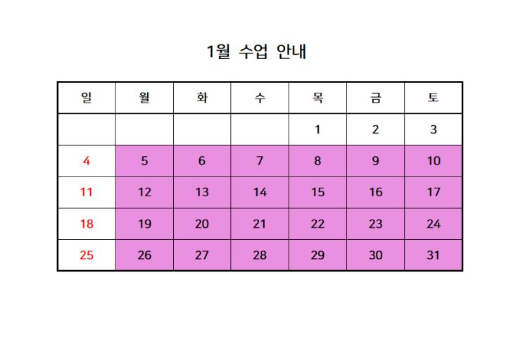 <특강 안내> ☆ 모의고사 풀고 오답 확인 ☆ 고전시가 녹화 강의 제공 (교재: 국어 독해의 원리-고전시가 ) ※ 별도의 특강비는 없습니다. 1월 수업은 1/5(월)~1/31(토)까지 4주 수업으로 진행됩니다. 1/1(목), 1/3(토)은 5주차로 수업을 휴강합니다. 수업 날짜는 핑크색 체크된 부분입니다. 확인 부탁드립니다. 감사합니다. <img src="https://blogthumb.pstatic.net/MjAyNTEyMjJfMjA3/MDAxNzY2Mzk3OTIwNjk5.pjDmaF8D_ITBP79zL7Kx1K0xjKILdNCZQgz3OBBJ1ywg.N-HYtpKp7We4qGBHEltBUZCoSUeLXdVbSREppAsd-8gg.PNG/1%BF%F9_%BC%F6%BE%F7001.png?type=s3" />