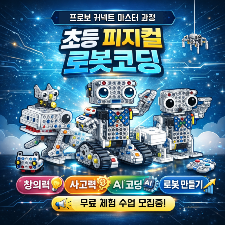 [광주 로봇코딩학원] 초등 AI 융합 사고력 로봇코딩 프로보 커넥트 마스터 과정 안내 수업 안내 추천연령 : 유아7세/초등 1~6학년 입문가능연령 : 유아7세~초등저학년(코딩 경험 없이도 가능) 수업시간 : 주 1회 90분 수업형태 : 소수 정원 / 개별 맞춤 지도 진행방식 : 조립 → 코딩 → 조작 → 미션수행 AI시대, 단순히 코딩만 배우는 수업으로는 부족합니다. 이제는 만들고, 설계하고, 논리적으로 사고하며, 스스로 문제를 해결하는 힘이 중요합니다. 광주 메이킹 로봇코딩학원에서는 초등학생을 위한 체계적인 AI융합 사고력 로봇코딩 프로그램, "프로보 커넥트 마스터 과정"을 운영합니다. 왜 프로보 커넥트 인가? 프로....... <img src="https://blogthumb.pstatic.net/MjAyNjAyMjBfMjkz/MDAxNzcxNTE5MDc3NzQ1.4z1k6Ms987cVugCfUHBrlH8KQdTOviNBTW80AfTyqOwg.CdgRttVQ5GzPRtdwa7vqhXKA1JzgjwhU4YbKYJRbS7gg.PNG/%B8%B6%BD%BA%C5%CD_%B0%FA%C1%A4.png?type=s3" />