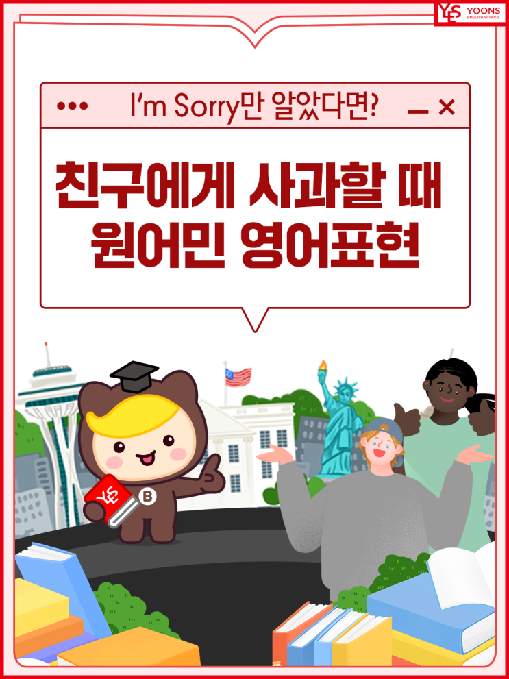 여러분들은 사과할 상황이 발생할 때 영어로 표현하는 법 아시나요? 영어로 사과할 때, “I’m sorry!” 만 생각 나는 경우 많죠?! 사과 표현도 상황이나 상대에 따라 말투를 바꾸면 더 부드럽고 센스 있게 전할 수 있어요. 가벼운 실수를 사과할 때 표현 MY bad ! 공식적으로 사과할 때 I apologize for ~ 불편을 끼쳤을 때 Sorry for the inconvenience. 상대에게 용서를 구하며 사과할때 Fofgive me 상황에 맞는 영어 표현 배우기 윤선생영어숲 일곡학원과 함께하면 좋습니다! <img src="https://blogthumb.pstatic.net/MjAyNTEyMDJfODQg/MDAxNzY0NjUyNzY2MDAy.8YKu8IYexKIIubKaVasKvyyv-qwfY3MGPC0IxVzsvTsg.qKmH4E4YavgNViZlHlLLnbRbPmyvYimH_cKojV3QX7cg.PNG/1p.png?type=s3" />