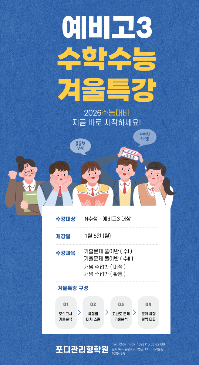 2026 수능대비 예비고3 수학 수능 겨울방학 특강 OPEN 2026년 1월 5일(월) 개강 8주 수업 포디관리형학원 ⭐예비고3 수능수학 겨울 특강⭐ ■ 기출문제 풀이반 1) 기출문제 풀이반 (수학Ⅰ) 2) 기출문제 풀이반 (수학Ⅱ) 최신 모의고사 기출 분석 자주 출제되는 유형 정리 및 분석 ■ 개념수업반 1) 개념 수업반 (미적분) 2) 개념 수업반 (확률과 통계) 개념 강의 부족한 개념 보완 및 유형별 문제 풀이 전략 ⭐관리 프로그램⭐ 수준별 맞춤 교육 시스템 실시간 1:1 질의 및 소통 자습시간 기록 및 관리 예비고3 수능 수학 8주 겨울특강 후 관리 기출 풀이 후 실전 문제 개념 수업 (~6월 말) 고난도 문제풀이(7월 ~) 실전모의고사 풀이(9월....... <img src="https://blogthumb.pstatic.net/MjAyNTEyMDhfNzEg/MDAxNzY1MjAyMTA3NDIw.44vCg9B184vjh5H_WFh1wJMKXLMjhSvhVrV41Mme4_Ug.d8d4Ib20ZFC5n_Vhveyi2-651TKyE4FD9lHZDuvtmxwg.PNG/%B0%ED3%BC%F6%B4%C9%BC%F6%C7%D0.png?type=s3" />