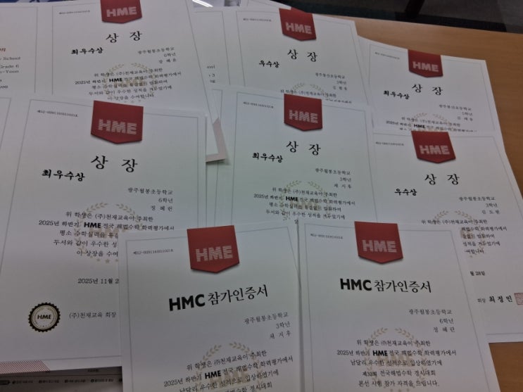 안녕하세요 위캔수학전문학원입니다 우리 친구들 HME 결과 상장과 메달이 도착했네요 본선 진출한 친구들 덕분에 저도 지도교사상 받았고요 매년 시험 볼 때마다 본선 진출하는 친구들이 있어서 저도 매년 상을 받네요~ 어찌나 고마운지요♡♡ 이 맛에 시험 준비하면서 더 열심히 파이팅 하게 되는 거 같아요^^ 내년 1월에 있을 본선 시험 준비도 시작되었습니다. 우리 친구들 최선을 다해 준비하고 준비시켜서 좋은 성적 거둘 수 있게 노력해 볼게요~♡♡ #첨단 수학 #산월동 수학 #봉산초등학교 #월봉초등학교 #봉산중학교 #월봉중학교 #hme 경시대회 #수학전문 #hmc 경시대회 <img src="https://blogthumb.pstatic.net/MjAyNTEyMjNfMTA3/MDAxNzY2NDY5MTAyMTM2.sd80NdKpYKKandEmwBWQIzKX_BIPHnkdPWqnutohYE0g.66iOf2Qjt_wdplOk5W21FXb3wINwWW8qp_-wHhCGX7Ig.JPEG/900%A3%DF20251218%A3%DF140027.jpg?type=s3" />