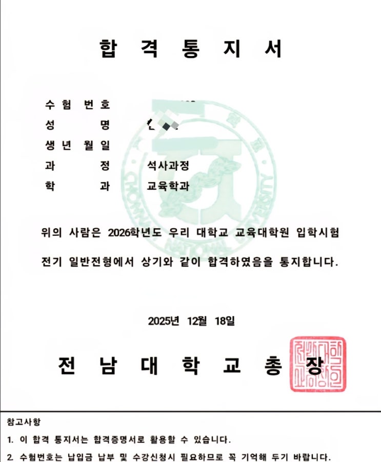 축하해주세요. 전문적인 영어교육자가 되기위해 26년 전남대학교 영어교육대학원 (일반양성과정) 필답시험과 면접에 도전하여 합격했습니다! 중고등부 2학기 기말고사 시험대비라 큰 기대는 못했지만 주어진 시간 정말 열심히 공부했습니다.(하루 3시간 잚) ■필답시험: 영어교육론(필수),영어학( 선택) 서술형으로 총 11문제 ■면접 이렇게 두 과정의 입학시험을 거쳐 감사하게 합격을 했습니다. 저도 대학원생으로 학생의 맘을 십분 이해하며 발전하는 써니샘이 되겠습니다. ♡메리 크리스마스♡ <img src="https://blogthumb.pstatic.net/MjAyNTEyMjVfOTcg/MDAxNzY2NjU3NzUxMTc4.IZlbvKLyzMz8BHxSxDXbh8dM8iGrf8han1rFl92PiwUg.Ge8zmd86Xg7JXzHZO9PHJagS6jfJEuJoEZ9lnzuD2Ywg.JPEG/900%A3%DF1766657750056.jpg?type=s3" />