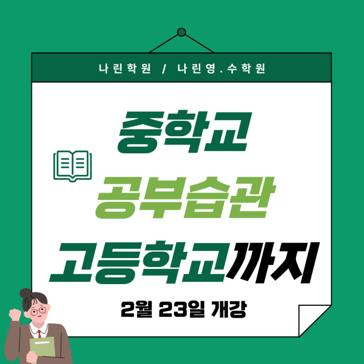 안녕하세요! [나린학원] [나린영.수학원] 입니다! 새학년, 새학기 시작이 얼마 남지 않았는데요! 나린에도 곧 새학기 개강이 찾아온답니다. 2월 23일 개강 새로운 시작을 앞둔 만큼 많은 걱정과 설레임이 가득할 텐데, 나린학원에서 중학교 공부습관 언제부터, 어떻게 잡을지 소개해드리려 합니다 :) 공부습관 외에도 중등부 시간표, 차량 운행 등 여러 정보가 담긴 글이니 꼭 끝까지 필독 부탁드립니다! 지금부터 중학교 공부습관이 얼마나 중요한지 설명해드리겠습니다! - 왜 중학교 때 공부 습관이 중요할까요? 중학교는 공부 난이도와 분량이 급격히 늘어나는 시기입니다. 이때 습관이 잡히지 않으면 -시험 전 벼락치기 -과제 미루기 -집중력....... <img src="https://blogthumb.pstatic.net/MjAyNjAxMjhfMjkz/MDAxNzY5NTk0ODE3MzM0.qi6jLTR0tmFYtiT-9kfzlcSMhsE4V198KnnLnpPfZt8g.t-JaUQsQKKgSEtF-7aH2LBRU1X00qT-Ppa7yrwePW1Ig.PNG/%B3%AA%B8%B0_%C1%DF%C7%D0%B1%B3_%B0%F8%BA%CE%BD%C0%B0%FC.png?type=s3" />