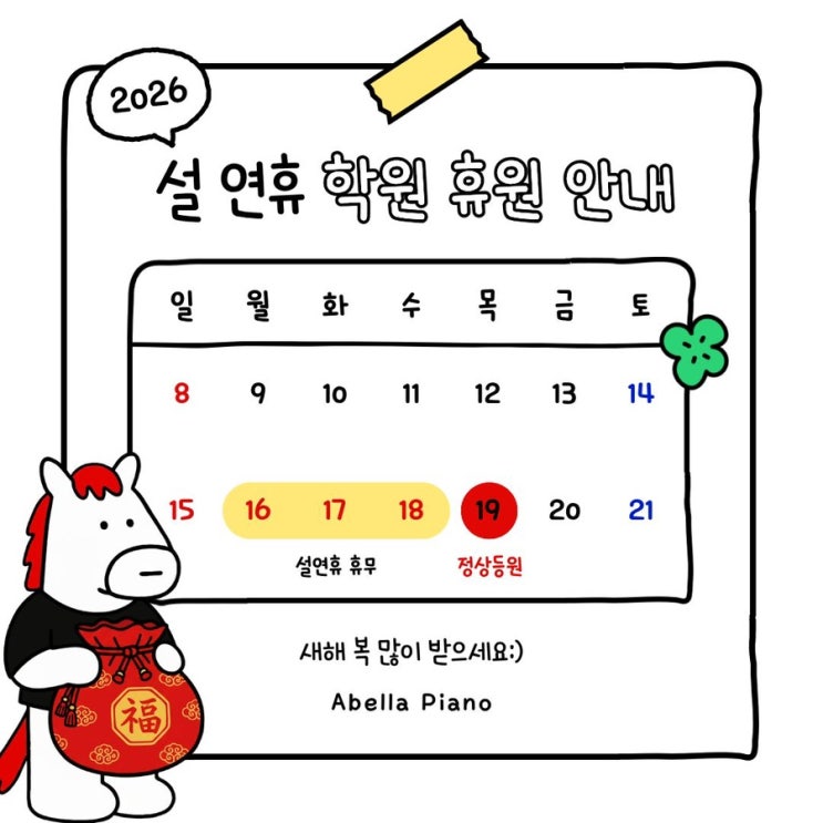 [대전 용전동 용전초 피아노 음악 학원] 아벨라 피아노 학원 설 연휴 휴원 안내