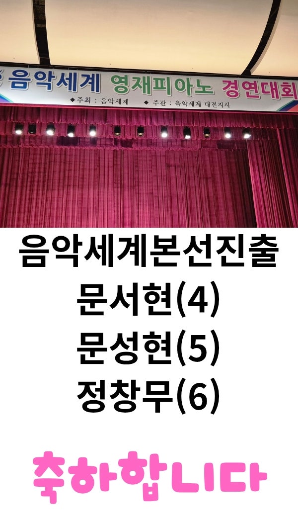 음악세계콩쿨본선 진출을 위한 대전.세종 음악세계 콩쿨이 진행되었다 . 독일 모차르트콩쿨만큼 심장 쫄깃... . 첫타임은 고등부.중등부 경연을 거쳐 유치부부터 ~초6까지 치루어진 경연이였다 . 화장실 잠시 다녀온 시간빼곤 한 순간도 눈을 뗄 수없었다. . 아이들은 눈에서 레이져를 쏘으며 건반에 시선을 고정시키고 몸으로 손으로 발로 음악의 흐름을 이끌어가는 진지한 모습이 무엇보다 감동적이였다. 아이들의 연주를 임하는 자세가 매우 진지했으며 분위기 또한 타인에게 누가 될까 조심하는 분위기였다. 뮤직톡 우리아이들은 생각보다 많이 높은 성적을 주셔서 아이들은 난생 처음 받아보는 점수라 믿어....... <img src="https://blogthumb.pstatic.net/MjAyNjAyMDdfNTUg/MDAxNzcwNDc0MDY0MDE3.nOzeuJFUOXIPeo0HfPTZZUMEvLiRx5Z0qivibYvROp0g.X-1KlFvnrvcG-HCyXMXNfSPQ_7w2NvKzWBW0O6uiJfsg.JPEG/%C8%AD%C0%CC%C6%AE_%BD%C9%C7%C3%C7%D1_%B0%B3%C0%CE_%C7%C1%B8%AE%B7%A3%BC%AD_%C5%A9%B8%AE%BF%A1%C0%CC%C5%CD_%BC%BC%B7%CE_%B8%ED%C7%D4%A3%DF20260207%A3%DF153915%A3%DF0000.jpg?type=s3" />