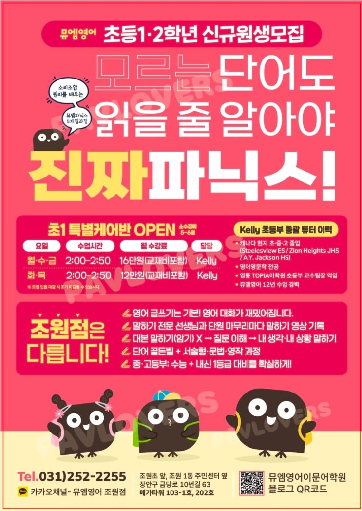 초등 1·2 학년 신입생을 모집합니다 초등학교에 입학하며 많은 학부모님들이 고민하시는 것 중 하나죠? 바로 영어 공부 시작 시기 입니다 특히나 초등 영어에서는 파닉스(Phonics) 기초가 중요한데요, 파닉스는 알파벳과 소리의 규칙을 배우는 과정으로, 아이들이 영어 단어를 스스로 읽을 수 있도록 힘을 길러주는 가장 기본 단계입니다 뮤엠에서는 단순히 단어를 외우는 방식이 아닌, 소시를 이해하고 스스로 읽을 수 있도록 체계적인 파닉스 학습을 진행합니다 초등 저학년 학생들을 위한 특별 케어반을 운영하여 아이들이 영어 공부가 부담이아닌, 재미로 느낄 수 있도록 지도합니다 ✔️ 영어 기초가 되는 파닉스 ✔️ 말하기 중심....... <img src="https://blogthumb.pstatic.net/MjAyNjAzMTJfMjc5/MDAxNzczMjkyMjc0OTAx.Lfr0kx5IUuXy58BRcTMgswXBKMt-1enCUyH8HaNdcUYg.xRUI9knGt2zZlUahhmoY9j4hUAo831YwgsTzcNrpn8gg.JPEG/KakaoTalk_20260311_121000298_01.jpg?type=s3" />