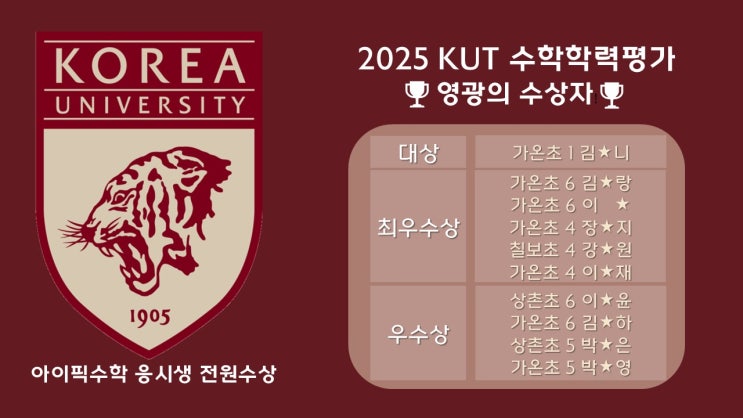 * 이번 2025 하반기 KUT 수학학력평가에 아이픽 수학학원 재원생 10명이 응시해서 10명 모두 수상했습니다^^ (대상을 받은 김★니 친구는 사진에 없네요) * 아이들이 모두 수상해주어서 우수 단체상도 받았습니다. * 열심히 준비한 친구들에게 박수를 보냅니다! <img src="https://blogthumb.pstatic.net/MjAyNjAxMDhfMTIz/MDAxNzY3ODUwMDg1ODE5.D7Z6yRL--ngk2yxR8vw9XRcYI_Nx2TZ0HVxvmepkBPAg.vUgpxwacvz5B-UVfB_rj5-w4QRHvk22-xKzG0YuAgbMg.JPEG/%BD%BD%B6%F3%C0%CC%B5%E514.JPG?type=s3" />