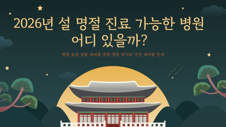 새해 복 많이 받으세요 ~~ 많은 분들이 오늘도 명절 연휴를 즐기실 것 같은데요 ~ 안아프고 건강했으면 참 ! 좋겠지만 명절기간동안 아플 때 병원 찾느라 당황하신 적 있으시죠? 오늘 저와 함께 병원 찾는법과 대처법을 함께 알아보도록 하시죠 !!! 2026년 설 연휴는 2월 16일부터 2월 18일까지 3일이고 주말 연결 시에는 최대 5일까지 쉴 수 있습니다. 명절기간에는 대부분 병원이 휴진하며 약국도 문을 닫게 됩니다. 그래서 응급실만 운영하게 되죠 응급상황이 발생 할 수 있는 가능성으로는 과식으로 인한 소화불량 음주 후 사고 증가 만성질환이 악화 될 수 있는 위험까지 ... !!! 그럴때는 진료 가능한 병원을 먼저 찾아봐야 합니다. 응급의....... <img src="https://blogthumb.pstatic.net/MjAyNjAyMTNfMjI5/MDAxNzcwOTUzMjMyMjcx.vlEp4YaEeCM9MHtI3AoNDnUv-qARZarAD3rC9hDD2i8g.3JAO_GI6ewD52_6mR9Fr1WZZjJuw5kWRddsiAJvDQc4g.JPEG/1.jpg?type=s3" />