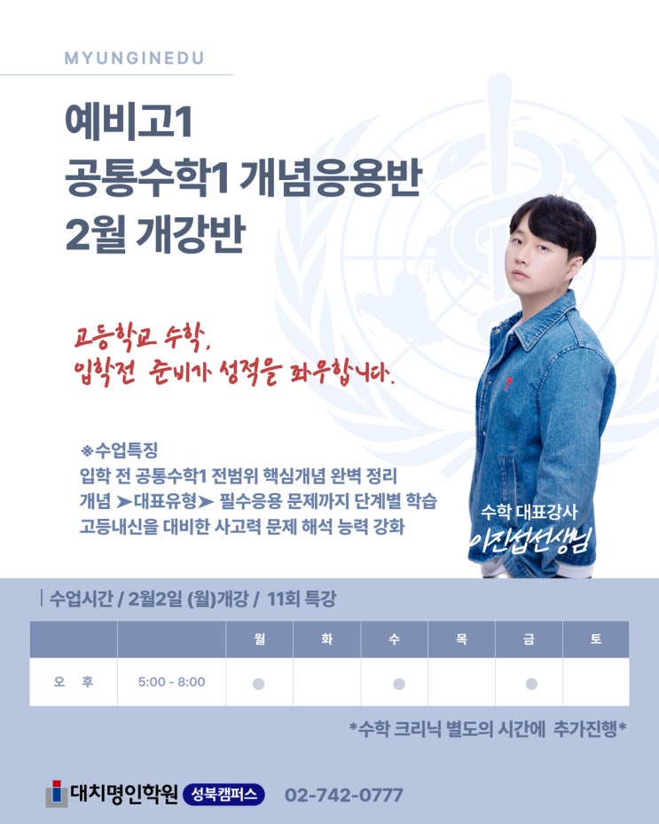 고등학교 수학은 ‘선행’보다 정확한 개념 이해와 적용력이 중요합니다. 미리 준비하는 고등내신 - 실전형 개념수업 ! ⏰ 예비고1 공통수학1 개념응용반 입학 전 공통수학1 전범위 핵심 개념 완벽 정리 개념 → 대표유형 → 필수 응용문제까지 단계별 학습 단순 풀이가 아닌, 고등 내신을 대비한 사고력 중심 문제 해석 훈련 고등 수학 학습의 기준이 되는 탄탄한 기본기 완성 학생 눈높이에 맞춘 개념 설명 실전 적용 지도 + 수학 대표강사 이진섭 선생님 실전강의 수업 일정 안내 - 개강일 : 2월 2일(월) - 수업 횟수 : 총 11회 특강 - 수업 시간 : 오후 5:00 ~ 8:00 - 수업 요일 : 월 / 수....... <img src="https://blogthumb.pstatic.net/MjAyNjAxMTdfMzAw/MDAxNzY4NjMyNzU3NDYw.xPwEtuW4YzwsLmszgbZGxJ5m0nxR2FF-NUont8HvjhYg.5OFc5XOAqCZ6FyB98hctRWtZCvg45CV1NimZBNmNyusg.JPEG/KakaoTalk_20260117_145211617.jpg?type=s3" />