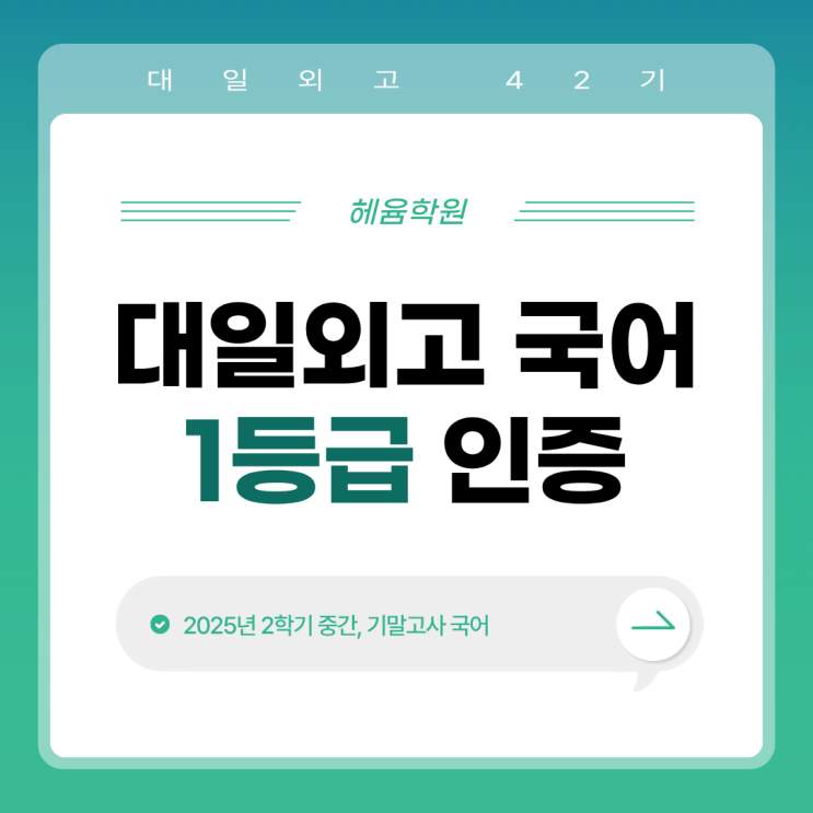 안녕하세요. 대일외고 전문 헤윰학원입니다. 헤윰 국어는 2025학년도 1학년 2학기 중간고사 및 기말고사에서 훌륭한 성과를 거두어 학기말 성적 1등급인 학생을 배출하였습니다. 다음은 학생과의 대화입니다. 대일외고에는 뛰어난 학생이 많기에 상위권 경쟁이 매우 치열한데요. 이러한 경쟁 속에서도 헤윰 국어와 함께 노력하여, 점진적인 상승 곡선을 그린 끝에 결국 1등급까지 얻어낸 우리 학생이 정말 자랑스럽습니다. 앞으로의 행보도 기대하며, 다시 한번 진심으로 축하드립니다. 헤윰 국어는 학생의 노력이 결실을 맺을 수 있도록 시험 대비에 최선을 다합니다. 국어 / 수학 / 영어 3인 수능*내신 전문가와 대일외고 선배 10인 학습 코치....... <img src="https://blogthumb.pstatic.net/MjAyNjAyMTRfMjY0/MDAxNzcxMDQ3MTExODAz.28s-7MO-jTPjigtVyQmRyHRAxDJr48O3Rp6wpsYcZqwg.TsnNXR8OvKSlb2E_zFLOznQKXRVKEKqP_pTL2wWKmmQg.PNG/2.png?type=s3" />