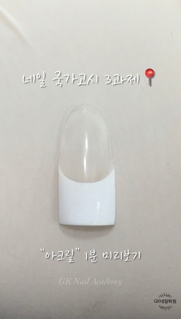 안녕하세요 네일국가고시 실무 등 네일아트전문학원 GK입니다. 다시 추워진 날씨에 모두 감기 조심하시구, 오늘은 네일국가고시 3과제 중에서도 많이들 어려워하시는 아크릴연장 규정과 꿀팁을 자세히 설명 드릴게요. 네일국가고시 중 3과제는 길이를 연장하는 과제이구요, 그 중에서도 아크릴연장은 깔끔하고 선명한 스마일라인과 쉐입이 중요한 종목이예요. 네일국가고시 연장 중 강도가 강해 유지력은 좋지만, 파일링이 어려운 과제이기도 합니다. 네일국가고시 아크릴스컬프쳐 규정 사항 시험시간 - 40분 시술범위 - 오른손 중지, 약지 연장길이 - 0.5 ~ 1cm c커브 - 20 ~40 % 두께 - 0.5 ~ 1mm 쉐입 - 스퀘어 1과제의 애나멜 컬러를 다섯손....... <img src="https://blogthumb.pstatic.net/MjAyNjAyMTlfOTEg/MDAxNzcxNDgwMzM2MjI5.gZWA43arXvHATCUuztR45smEzjSP8AyrBYkGBmKiF2kg.xrqcPGRm4dfUplSnIHu3SY1iVJhJg-OwktDyawQM5RUg.JPEG/KakaoTalk_20260219_141222112.jpg?type=s3" />