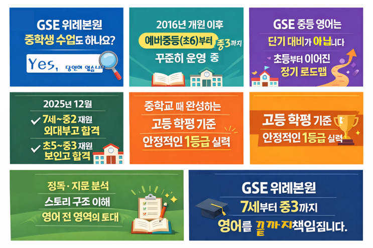 #GSE어학원 #위례 초등 영어 #위례 중등영어 #Active Learning English #Fun, Active, Positive #박거성 #대치영어 "GSE 위례본원에서 중학생 수업도 하나요?" 네!! GSE 위례 본원에서는 중학생 수업을 꾸준히 해오고 있습니다. "GSE 위례본원에 중학생도 있나요?" 블로그나 상담을 통해 위와 같은 질문을 정말 많이 받습니다. 결론부터 말씀드리면, GSE 위례 본원은 중학생 수업을 꾸준히, 체계적으로 운영해오고 있습니다. 2016년 개원 이후, 지금까지 단 한 해도 빠짐없이 예비중등(초등 6년) 중학교 1~3학년 을 대상으로 연속적인 영어 학습 과정을 운영해 왔습니다 현재는 개원 10년 차에 접어들었으며, 초등->예비....... <img src="https://blogthumb.pstatic.net/MjAyNjAxMDdfNTMg/MDAxNzY3NzY0NDA1MzU5.wipyXpYWj9GCmi8FDzAgic5jPcSzX_quynzIOgqXjsYg.VV1mfn55akAMRZGZU8DomLnG5io8D0X_3nHa_uoIoV0g.PNG/ClipboardImage_2026-01-06_211623.png?type=s3" />