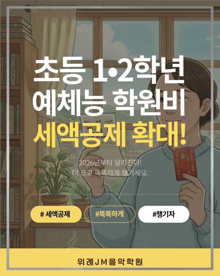 ✅️ 2026년, 초등 1·2학년 예체능 학원비 세액공제, 무엇이 달라질까요? 그동안 예체능 학원비는 '필요하지만 공제는 안 되는 지출' 로 여겨졌습니다. 하지만 세제개편을 통해 예체능 교육에 대한 인식이 달라지고 있습니다. ❗️특히 초등 저학년 자녀를 둔 가정이라면 꼭 알아두셔야 할 변화입니다. 초등 1·2학년 예체능 학원비 세액공제 요약 1️⃣ 적용 시기 2026년부터 적용 ✅️ 초등 1·2학년 자녀의 예체능 학원비 연 300만 원 한도 내 15% 세액공제 가능 즉, 초등 저학년 예체능 학원비가 교육비 세액공제 대상에 포함됩니다. 2️⃣ 신용카드 소득공제 기본 구조 ✔️ 신용카드 : 최대 15% 3️⃣ 2026년부터 변경된 핵심....... <img src="https://blogthumb.pstatic.net/MjAyNjAxMTJfMTUg/MDAxNzY4MjI1MjQ4NTAz.VxSGT2RsQMZ-iMKG-mx7QVLLUgUBcrs04MJPpXCgYVcg.m3JowqSuQlJ-Evwad2YpaVq6hhwrs8Jh3B8XeHVVTHYg.JPEG/CYMERA%A3%DF20260112%A3%DF224024.jpg?type=s3" />