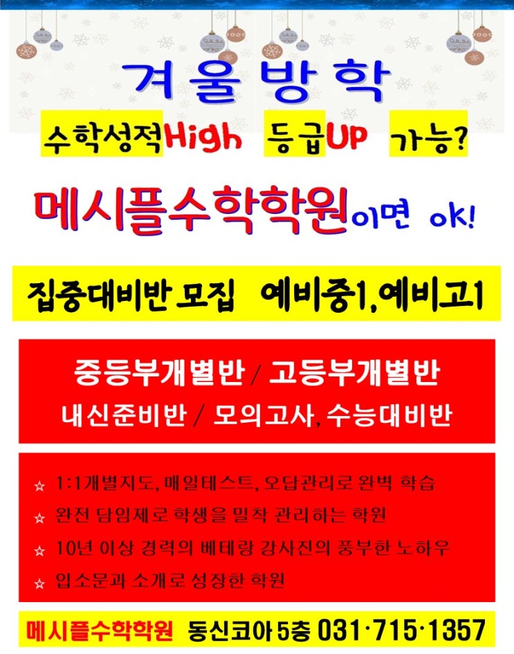 안녕하세요? 병오년 새해가 밝았습니다. 2026년에도 붉은 말처럼 메시플수학학원 선생님과 학생들은 열심히 달리겠습니다 새해 복 많이 받으세요~ 겨울방학을 맞아 황금같은 시간을 어떻게 보낼까 고민하는 학부모님과 학생들은 주목해 주세요 메시플수학학원에서는 이번 겨울방학에도 체계적인 학습으로 다음학기를 준비하려고 합니다 언제든 상담문의전화 주세요~^^ 031-715-1357 <img src="https://blogthumb.pstatic.net/MjAyNjAxMDhfMTQ4/MDAxNzY3ODcwMDkwNTE4.m1wUOaEFBDpsk-gG1W-1NYtyJuvLt719ywE7bke-u0gg.G43nGgejqa6mobpqTr3NIk4__K_n7GSSUqh2nud7mosg.JPEG/%C6%C4%C6%F7_%B0%DC%BF%EF%B9%E6%C7%D0%C6%AF%B0%AD.jpg?type=s3" />