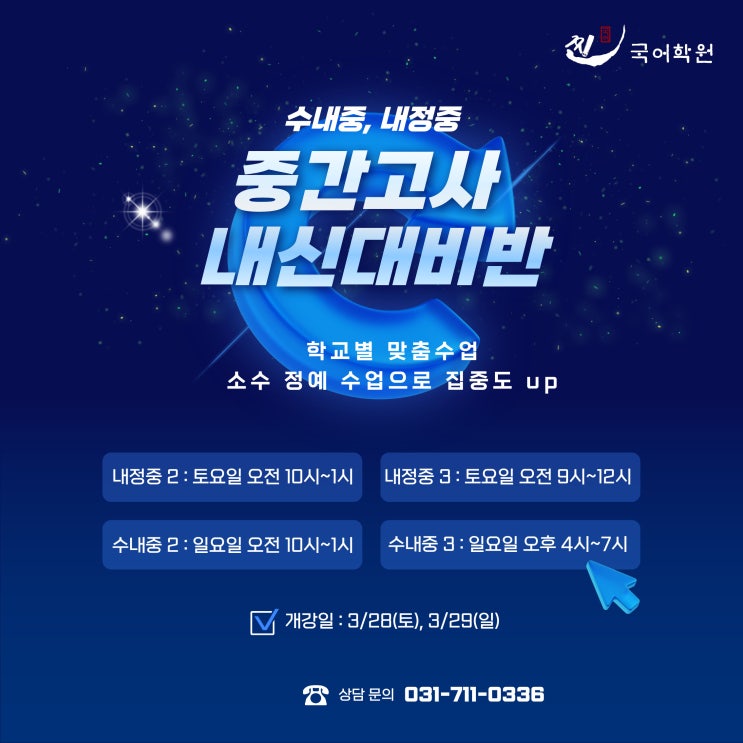 안녕하세요.찐국어학원입니다. 1학기 중간고사대비 수내중, 내정중 내신대비반이 개강합니다. 기출분석을 통한 학교별 맞춤수업을 진행합니다. 등록 및 문의는 학원으로 연락해주세요. <img src="https://blogthumb.pstatic.net/MjAyNjAzMTFfMyAg/MDAxNzczMjEzNTg4MjA3.DD3-p2AMaR8dKICJfVGXufuLqZptiwW317TBTBUD9Wkg.4lS5x_KwPRmof6qLAtj263tuZy8WxGCKCF4yEP3WHlcg.JPEG/%BC%F6%B3%BB_%B3%BB%C1%A4_%B3%BB%BD%C5%B9%DD.jpg?type=s3" />