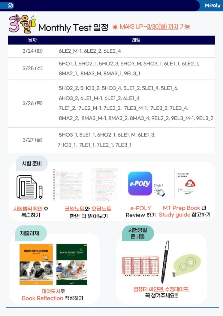 안녕하세요, 분당엠폴리어학원입니다. 3월 Monthly Test 일정 및 범위 안내드립니다. 중등2-3학년은 모의고사+문법+Essay 응시 예정으로, 숙제게시판을 통해 시험관련 안내 드리겠습니다. 시험 당일 결석 시, 반드시 Make up 일정을 잡아주세요. ✅ Make up: ~3/30(월) 까지 가능 ✅ Monthly Test는 강의실 내 태블릿을 이용한 온라인 시험으로 진행됩니다. 감사합니다. <img src="https://blogthumb.pstatic.net/MjAyNjAzMTZfMTY3/MDAxNzczNjQ1MzMyMDEz.KzX9Od5fqQs5fKhyJNclakKmOiy29LbP-KShCWbQhIMg.elN7adiE-8dA4T2V7AF-3hzARo4vBqa-9l0jT5RAf4Ag.JPEG/3%BF%F9_MT_%BE%C8%B3%BB%B9%AE_%281%29.jpg?type=s3" />