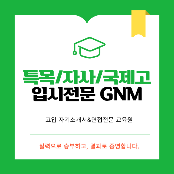 GNM학원 7년의 시간, 그리고 결과로 증명해온 이야기. 안녕하세요. 특목/자사/국제고 자소서&면접 전문 GNM 학원입니다. 2020년 시작한 GNM 학원은 2026년인 올해 어느덧 7년 차 교육원이 되었습니다. 작은 학원으로 출발해 지금의 어엿한 교육원이 되기까지 정말 많은 학생들을 만났고, 그만큼 기쁘고 아쉬운 다양한 순간들을 함께 지나왔습니다. 저희의 슬로건과 걸맞게 "실력으로 승부하고, 결과로 증명하며" 지금 이 자리까지 올 수 있었다고 생각합니다. GNM 학원은 이 블로그를 제외하고는 별도의 홍보활동을 하지도, 해본 적도 없습니다. 오직 학부모님들의 소개와 입소문만으로 '아는 사람들만 아는 학원'으로 자....... <img src="https://blogthumb.pstatic.net/MjAyNjAxMjhfMjY3/MDAxNzY5NTY2MjkyMjI3.JIRS9lc8KRQm98oxP5YLry3ZigB7k5fA_B7SJeTJz0og.0Hu9ZkfmPPt1arqOYTbl_snernQjsOWPdXkpUvlNGL4g.PNG/%C6%AF%B8%F1%C0%DA%BB%E7%B1%B9%C1%A6%B0%ED_%C0%FC%B9%AE.png?type=s3" />