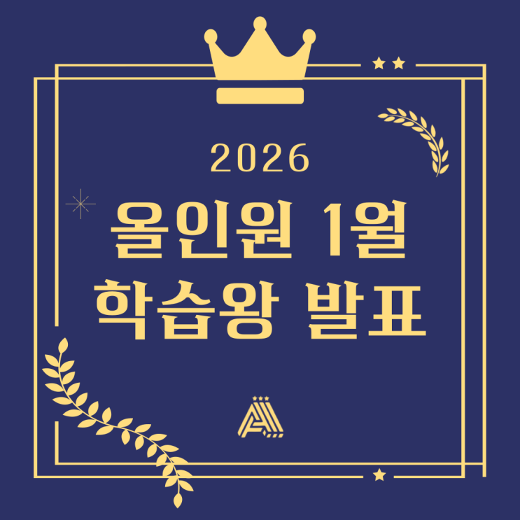 꾸준한 노력, 올바른 학습 습관, 성실한 태도. 수학 실력은 ‘매일 잘하려는 마음’에서 비롯됩니다. 올인원은 매월, 자기관리와 문제해결력, 수업 태도 전반에서 가장 모범적인 학습자를 ‘학습왕’으로 선정하여 발표하고 있습니다. 1월 학습왕 발표! 이번 1월에도 최선을 다해준 친구들이 있었습니다. 그 소중한 성장을 함께 축하해 주세요! 작지만 따뜻한 보상도 함께 선정된 학습왕 친구들에게는 올인원에서 준비한 기프티콘이 발송됩니다. 가정에서도 따뜻한 칭찬과 함께 아이의 노력을 꼭 격려해 주세요! “매일의 습관이, 실력을 만듭니다.” 성적은 결과일 뿐, 올인원이 중요하게 생각하는 건 과정 속의 태도와 꾸준함입니....... <img src="https://blogthumb.pstatic.net/MjAyNjAyMDRfMjA4/MDAxNzcwMTY0ODcxMTg4.UtYH_rf00oTFQCnt5jT4j_dlpqArtnz2YCArSmDyiTEg.p6DwtdamjPqnJ9DqweQaxUCMP3yBlMKn35BG0P0w3TQg.PNG/%BA%D0%B4%E7_%BF%C3%C0%CE%BF%F8_%C3%CA%B5%EE_%BC%F6%C7%D0%C7%D0%BF%F8_1%BF%F9_%C7%D0%BD%C0%BF%D5_%C7%D0%BD%C0%B0%FC%B8%AE_%282%29.png?type=s3" />