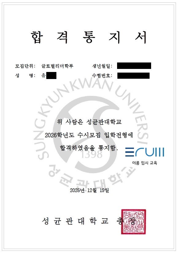 부드러운 어조로 팩트로 뚜드려 맞으니 의외로 자존심이 상하지않고 오히려 "이 부분은 실수하면 안되겠다. 이렇게 써야겠다."라는 생각이 들었습니다. 성균관대학교 글로벌리더학부 교과성적 : 2.4 수능성적 : 1 3 2 1 3 논술 준비기간 : 6개월 저는 고3이 될 때까지 정시에 집중하고 있었고 수시에 대한 준비가 막연한 상태였습니다. 내신은 나름 챙긴다고 챙기긴 했는데 세특이 A급 아니어서 제가 원하는 대학의 학과를 가기엔 부족한 상태였습니다. 특히 제가 희망하는 대학들은 교과로는 많이 부족했고 학종으로도 아쉬움이 남는 생기부였기에 정시에 더 집중했지만 아슬아슬하게 받아내는 모의고사 등급은 저에게 충격을 주었습....... <img src="https://blogthumb.pstatic.net/MjAyNjAyMDRfMjc2/MDAxNzcwMTc0NzIwNTMx.7YwxeT-e-EejRqIqmVMjsgjJp02L9l0ZuSwIIptn-rwg.iplj61MJUcu3joOo7bYxnZGDuQllbG93gQFnLgF3X-Eg.JPEG/2026%C7%D0%B3%E2%B5%B5%BA%D0%B4%E7%C0%CC%B7%EB%B3%ED%BC%FA%BC%BA%B1%D5%B0%FC%B4%EB%B1%DB%B7%CE%B9%FA%B8%AE%B4%F5%C7%D0%BA%CE%B3%ED%BC%FA%C7%D5%B0%DD%C1%F5.jpg?type=s3" />