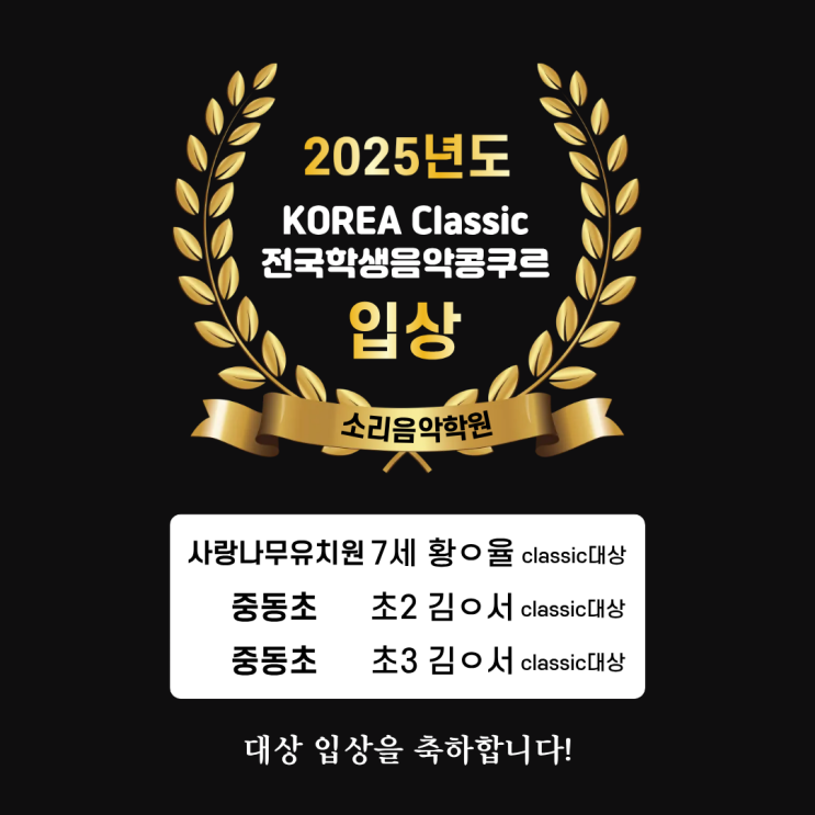 안녕하세요. 소리음악학원입니다. 지난 12월 20일 토요일에 열린 전국학생콩쿨에 소리음악학원 아이들 3명이 참가하여 모두 코리아클래식 대상에 입상하는 뜻깊은 성과를 이루었습니다. 7세 황○율, 초등학교 2학년 김○서, 초등학교 3학년 김○서 학생에게 진심 어린 축하의 박수를 보냅니다. 이번 결과는 아이들의 노력도 물론이지만, 항상 곁에서 믿고 기다려주시며 묵묵히 응원해 주신 학부모님들의 사랑과 지지가 있었기에 가능했던 성과라고 생각합니다. 바쁜 일상 속에서도 연습 시간을 지켜주시고, 아이들이 음악을 즐기며 성장할 수 있도록 함께 마음을 모아주신 학부모님들께 소리음악학원은 진심으로 감사드립니다. 또한 어려운 곡과....... <img src="https://blogthumb.pstatic.net/MjAyNjAxMDJfMTk2/MDAxNzY3MzQ1OTkxOTgx.mss6ixVykX9_d-DddY0GoF6mV-rKWym4UURA76seFcMg.wrMZ52T32Vg3eW3njdHz_TfB1gJIz4u6hf1DK6aPZHwg.PNG/KC%C0%D4%BB%F3.png?type=s3" />
