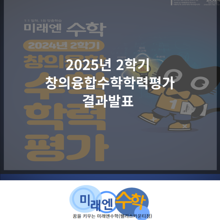 안녕하세요 중동 미래엔 수학입니다 이번 2학기 창의 융합수학 학력평가에서 미래엔 친구들의 꾸준한 학습과 성실한 과정으로 값진 결과를 만들었습니다 이번 미래엔 수학 2학기 창의 융합수학학력평가를 통해 아이들의 수학 실력이 단순한 점수가 아닙니다 학부모님께 드리고 싶은 말씀~ "수학은 갑자기 잘 해지 않습니다." 수학은 과정이 필요한 과목입니다 시험 대비는 매일매일 학습을 통해서 늘 준비하는 것입니다 시험 기간에는 학습에 대한 문제 풀이 속도를 높이고 학습을 확인을 하는 것입니다 시험 대비 기간의 준비는 이미 늦은 것입니다. 초 1~2학년 : 수학 공부의 첫 출발선 이번 평가에서 초 1학생의 수상은 문제를 끝까....... <img src="https://blogthumb.pstatic.net/MjAyNjAxMTBfMTM2/MDAxNzY4MDAyMTYzMjUz.LOspzOARl4qweaNKOtnU1EJw427mAaKIhopiagNP8ngg.KTjPSyldoEvDvy39W7tVfYy6SlA6io03lspULBhyFdog.PNG/%BB%E7%BA%BB_-AS687D.png?type=s3" />
