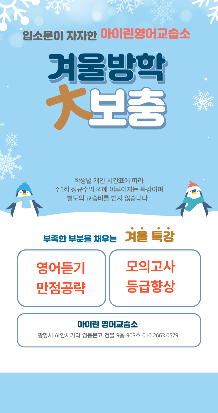 겨울방학의 여유시간을 활용한 듣기 & 모의고사 특강이 총 5회간 이루어 졌습니다. 주1회 정규수업 외에 이루어지며, 별도의 교습비를 받지 않았습니다. 듣기 중학생은 각 학년보다 1단계 높은 듣기 모의고사를 실시, 부족한 유형학습과 받아쓰기를 고등학생은 수능유형 PICK 듣기교재로 모의고사를 실시, 부족한 유형학습, 받아쓰기를 했습니다. 평소 시간이 없어 충분히 공부하지 못한 듣기를 보충하면서 실력을 향상시킬 수 있었습니다. 고등학교 모의고사 학생마다 개별적으로 이루어 졌습니다. 2027년 자이스토리 실전을 모두 마치고 시험을 친 학생도 있고 고1 모평 교재를 병행하면서 시험을 친 학생도 있어요. 실제 시간과 동일하게....... <img src="https://blogthumb.pstatic.net/MjAyNjAyMjFfNzAg/MDAxNzcxNjQ3MTI1Mjk5.9ex-CivzVCCHktKt4bD2bfMCAN7vRvbyYDbwx1UkKjAg.oh1QEP5dJrUSSZBDuwvWkKUspdMdGSBt158vpYwIO00g.PNG/%B0%DC%BF%EF%B9%E6%C7%D0_%C6%AF%B0%AD.png?type=s3" />