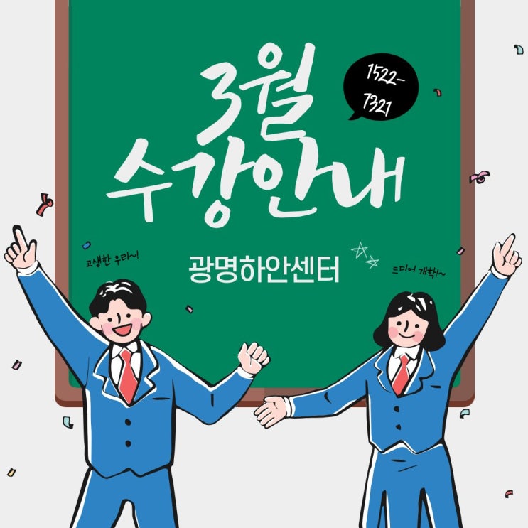 긴 겨울방학이 끝나고 새학년 새학기가 시작되는 3월입니다. 새롭게 입학하는 학생들 모두 축하하고 새로운 학교 생활도 잘 해 나가길 바랍니다. 3월은 영어로는 March, 로마의 전쟁신 Mars에서 유래해 군대의 행진을 시작하는 달이라는 의미가 담겼습니다. 옛말에 "시작이 반이다"라는 속담이 있는데 이말은 ‘시작이 좋으면 끝이 좋다’라는 말과 함께 쓰이기도 하지요 그만큼 시작이 중요하다는 뜻이겠지요 공부도 당연히 시작이 중요합니다. 새롭게 바뀐 교과서 내용을 이해하고 진도에 맞춰 예습, 복습을 철저히 하게 되면 아이들은 자연스럽게 공부에 대한 자신감을 갖게 되어 학교 생활을 더 즐겁게 할 수 있을겁니다. 새롭게 시....... <img src="https://blogthumb.pstatic.net/MjAyNjAyMjRfMjEz/MDAxNzcxOTE1MjA2OTg5.LqLnuPr7PIm_6HJngDZJCVMo_nGa7cJJf01V6ASBGSYg.2VCZVkSK1NTPIs1GykEd7DqdUn4v0a1QYEVe4Zj9i2sg.JPEG/%BD%BD%B6%F3%C0%CC%B5%E51.JPG?type=s3" />