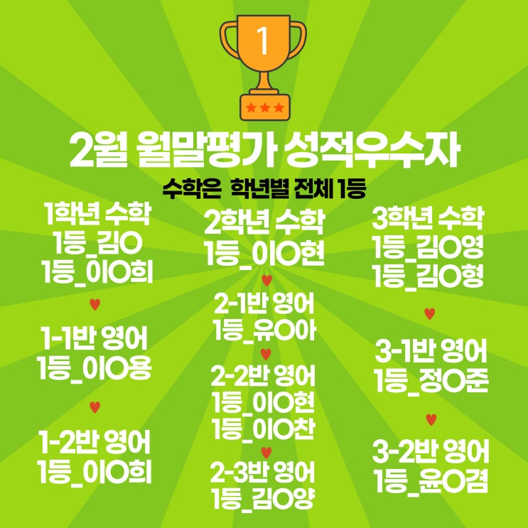 3월 월말평가 기간: 3월24일~27일 입니다! 매달 월말평가를 보는 이유는 부족한 부분을 보충을 해주기 위해서 입니다. 1등을 게시한 이유는 한달간 열심히 공부하고 좋은 결과를 내었기에, 동기부여를 주기 위하여 게시합니다 초등 6학년반은 실력,심화 문제로만 출제되어 까다로운 서술형 문제가 많았습니다^^ 앞으로도 우리 초등부 아이들이 수학을 더 깊게 생각하고 꼼꼼히 풀도록 지도하겠습니다. 감사합니다♡ <img src="https://blogthumb.pstatic.net/MjAyNjAyMjdfMTA4/MDAxNzcyMTk2Mjg1Nzgw.Oqk3QXhXO3aIlTclWGibiJs74P4halFEK93JBBTThi4g.WAKQfJizkteCp7fMA8GwjmjWqYQT7tXicgMaK-jx_Pog.JPEG/2%BF%F9-%BF%F9%B8%BB%C6%F2%B0%A1_1-001.jpg?type=s3" />