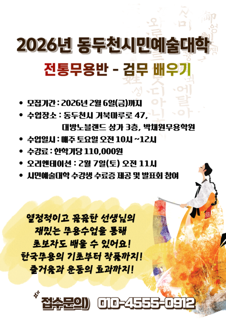 안녕하세요! 2026년 동두천 시민예술대학 전통무용반을 신규모집합니다. 올해는 '검무'를 배울 예정입니다. 검무는 칼을 돌리며 추는 춤으로 날렵한 칼의 움직임 속에서 강렬하면서도 부드럽고, 매우 흥겨운 매력을 가진 멋진 춤입니다. 한국무용의 기초부터 검무의 칼 돌리는 방법까지 다년간의 교육경험을 바탕으로한 박채원 원장님의 디테일하면서 재밌는 설명과 멋진 춤 시범으로 차근차근 배울 예정이니 주저하셨던 분들도 새로운 취미를 찾고 계셨던 분들도 처음하시는 분들도 남녀노소 누구든 배우실 수 있습니다! 전통무용반 수업을 통해 멋진 검무의 매력으로 접해보시기 바랍니다. 접수기간이 얼마 남지 않았으니 서둘러주세....... <img src="https://blogthumb.pstatic.net/MjAyNjAxMjhfMjkx/MDAxNzY5NTkxNDUxMzI0.Cbmso2mfgkKAlEk8KOz2PDWTXiN-JyeAmIkrnkIXEhwg.Gd_uTcZPrAdKqZUxvhg3jvTZd_562V8_QWxBPsYrDtcg.PNG/%C1%A6%B8%F1%C0%BB_%C0%D4%B7%C2%C7%D8%C1%D6%BC%BC%BF%E4_-001_%286%29.png?type=s3" />