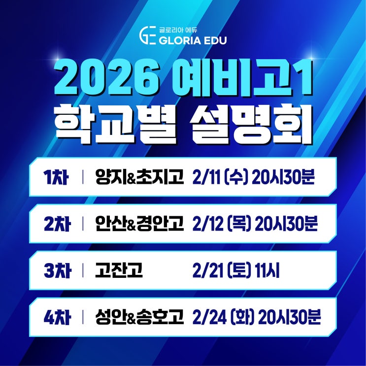 대학을 바꾸는 글로리아, 결과로 증명하는 입시 2026 메디컬 5명, 연고대 6명 주요대학 67명 합격! 매년 안산내 가장 탄탄한 정보력으로 입학을 앞둔 고1 학부모님과 학생들이 가장 기다리시는 '글로리아 예비고1 학교별 설명회'를 진행합니다! “이 학교… 괜찮은 거 맞아?” 라는 생각이 들었다면.. 고등학교 배정은 끝났지만, 진짜 중요한 건 지금부터입니다. 고등학교에서 성적이 갈리는 건 "공부량"보다 "정보의 차이"입니다. 글로리아에서는 안산시 고등학교 실제 데이터로 설명합니다. 우리 학교 시험, 왜 어렵게 느껴지는지 선택과목, 대충 고르면 왜 손해인지 과목별 내신 등급컷, 현실적으로 어디까지 가....... <img src="https://blogthumb.pstatic.net/MjAyNjAyMDJfMjcy/MDAxNzcwMDAwOTE2NzM0.3hfKEVnfo_6WfUDJFh-e6BVW_WjNNFa1XEbX2kLnBZ0g.jKckN7ek9zvsY4Q1VCxhljs2q20Eg_k-0d1wRF_TwBQg.JPEG/00.jpg?type=s3" />