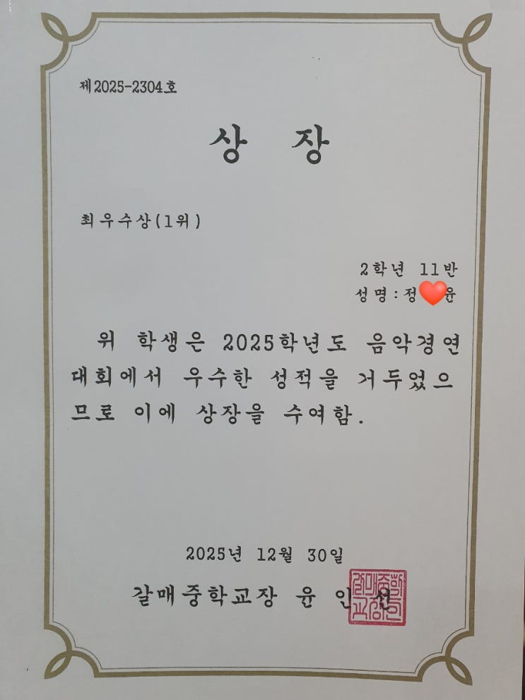 <갈매동 피아노 학원> 갈매 중학교 음악 경연 대회 1등, 2등 수상❤️