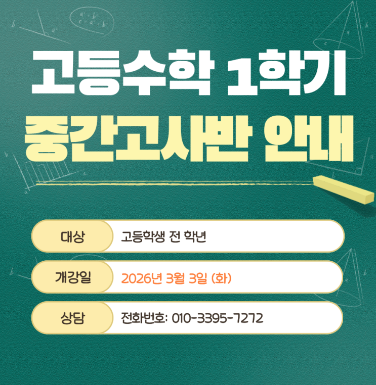 새 학기마다 고민되시죠? "이번 학기는 정말 제대로 잡아줘야 하는데…" 3월, 새로운 시작! 구리 송수학 봄학기 개강 안내드립니다. 초·중·고 전 과목(국·수·영·과) 3월 첫째 주 개강 성적이 달라지는 봄학기 시작합니다. ✔ 중간·기말 완벽 대비 ✔ 상위권 100점 전략 ✔ 학교별 출제 경향 분석 반영 ✔ 심화·선행 병행 시스템 입학 테스트를 통해 아이의 현재 실력을 정확히 진단 후 가장 적합한 반으로 배정합니다. 테스트 및 상담 예약 가능 월~금 오후 2:30~8:00 토 오전 10:00~ 오후5:00 일 오전 10:00~ 오후 1:00 *사전 예약 필수* *테스트 및 상담비는 2만원입니다.* *결과 상담도 사전 예약제로 운영됩니....... <img src="https://blogthumb.pstatic.net/MjAyNjAyMjRfMjA1/MDAxNzcxOTE4MDIyNzA4.43K84fX1ExJxAyr2mVXYcZOYTJCxEh0-1oppnN6H1KMg.tcZycDl3LIEtLZ1yVOebzd6uayXd8WTyy8QyYrdK0scg.PNG/%C1%A6%B8%F1%C0%BB-%C0%D4%B7%C2%C7%D8%C1%D6%BC%BC%BF%E4_-007_%283%29.png?type=s3" />