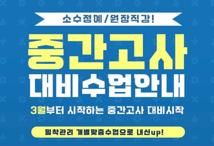 안녕하세요 대치S수학학원 원장 대치설쌤 입니다 확장이전 한지 2개월 정도 되어가는데 더 넓은 공간에서 겨울방학동안 재원생들과 정말 바쁜나날을 보냈습니다 이제 주말이 지나면 개학이고 우리 친구들은 내신대비를 위해 다시 달려야 합니다! 대치S수학에서는 3월부터 내신대비 수업이 시작됩니다 설쌤과 열정적으로 공부할 고등부 학생 모집중입니다 중등부 전원 100점! 고등부 1등급을 목표로 내신대비자료를 준비하고 개별 오답관리를 철저하게 하고 있습니다 그럼 내신대비 수업은 어떻게 진행되는지 안내드리겠습니다 1. 데일리 Test 이전 수업내용을 잘 이해했는지 숙제와 복습을 잘 했는지 확인하기 위한 테스트 입니다 또한 내신기출....... <img src="https://blogthumb.pstatic.net/MjAyNjAyMjhfMjQ3/MDAxNzcyMjE0MjAzMjkx.ANS1eFUWAJKJTD9AD_O7dPS5r-5hdfEbAwJK2AR19q0g.ou6fYtVz7ip2v7eNQ1TbAiLiyzCA-U6G24y3IVcKSE8g.JPEG/IMG%A3%DF2608.jpg?type=s3" />