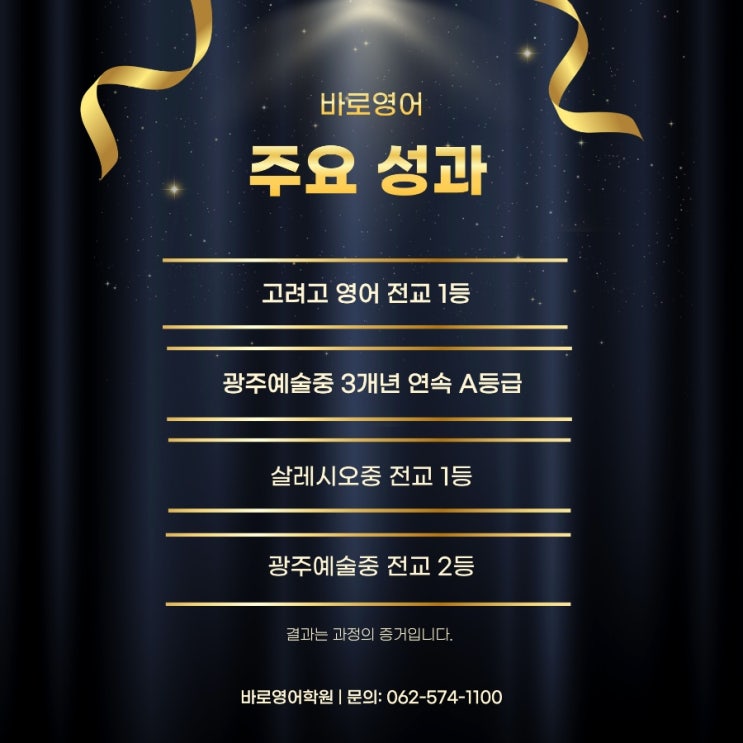 바로 영어 주요 성과 결과는 과정의 증거입니다. 고려고 영어 전교 1등 광주 예술중 3개년 연속 A등급 살레시오중 전교 1등 광주 예중 전교 2등 광주 예고 영어 전교 2등 입회 2개월 동신중 30점 향상 입회 2개월 숭일중 20점 향상 입회 1개월 양산중 30점 이상 향상 입회 5개월 금호 중앙 여고 50점 이상 향상 ▫️소수 정예 ▫️클리닉 수업 ▫️1:1 피드백 ▫️월말 테스트 [입회 문의] 010.9810.9229 (원장 직통, 문자) 수업 혹은 업무로 즉시 통화가 어려운 경우가 많습니다. 문자 남겨주시면, 확인 후 연락드리겠습니다. 위치 : 광주 북구 매곡동 대광로제비앙 상가 1층 #성적우수자 #성과 #광주북구매곡동영어 #소수정예 #일대일피드백 #클....... <img src="https://blogthumb.pstatic.net/MjAyNjAyMTBfMTc0/MDAxNzcwNzE3ODE0Njk1.Uen43zTeMH55GCLPDWtZTW6nXet-RTjgYVXy8QkZtyMg.3rKU4SZaW1dO_jFZm7pMCqrnXPd6BDD8as-s0ZvrxKYg.JPEG/900%A3%DF%C1%A6%B8%F1%C0%BB_%C0%D4%B7%C2%C7%D8%C1%D6%BC%BC%BF%E4.jpg?type=s3" />