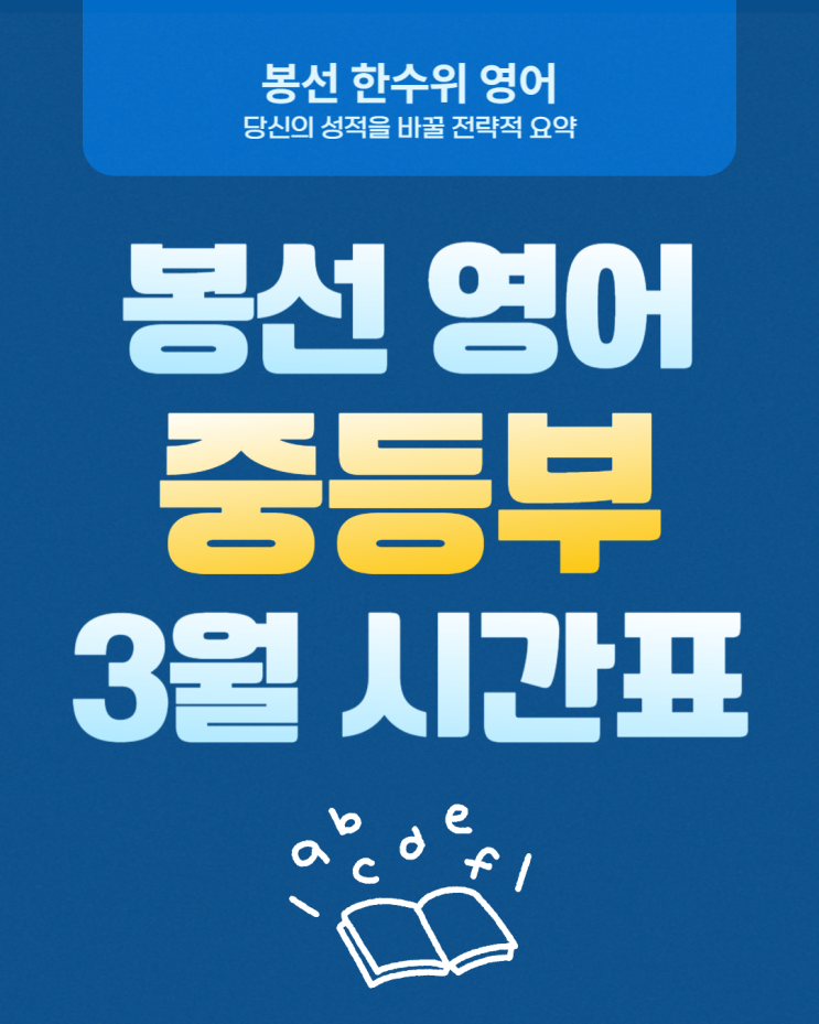 안녕하세요. 봉선동 한수위 영어학원입니다. 새 학기를 맞아 봉선동 한수위 영어 중등부 3월 개강 시간표를 안내드립니다. 왜 중등 영어가 중요할까요? √중등 어휘력은 고등 독해 성적의 기반이 됩니다. √문법 이해도가 부족하면 고등 서술형, 어법 문제에서 반드시 한계를 드러냅니다. √중등 때 형성된 독해 방식이 고등 영어 성적을 좌우합니다. 고등 영어는 긴 지문 높은 어휘 난이도 서술형, 어법 중심 평가 로 구성됩니다. 이 모든 것은 중등 과정에서의 학습 습관과 실력에 의해 결정됩니다. 그래서 봉선동 한수위 영어학원은 중등 영어를 '그때그때 시험 대비'가 아닌 고등까지 자연스럽게 이어지는 과정으로 지도합니다. 성....... <img src="https://blogthumb.pstatic.net/MjAyNjAyMTJfMTUy/MDAxNzcwODU5MDM1MDM4.FagB6Ebs_B6gJMLMJIpC6UZNCg0hpBF6tTUMBj2YL3Ag.MMhsb4SA37vleIjtyh34YEzuAIv7luvvAvVFIQgLWZQg.PNG/002.png?type=s3" />